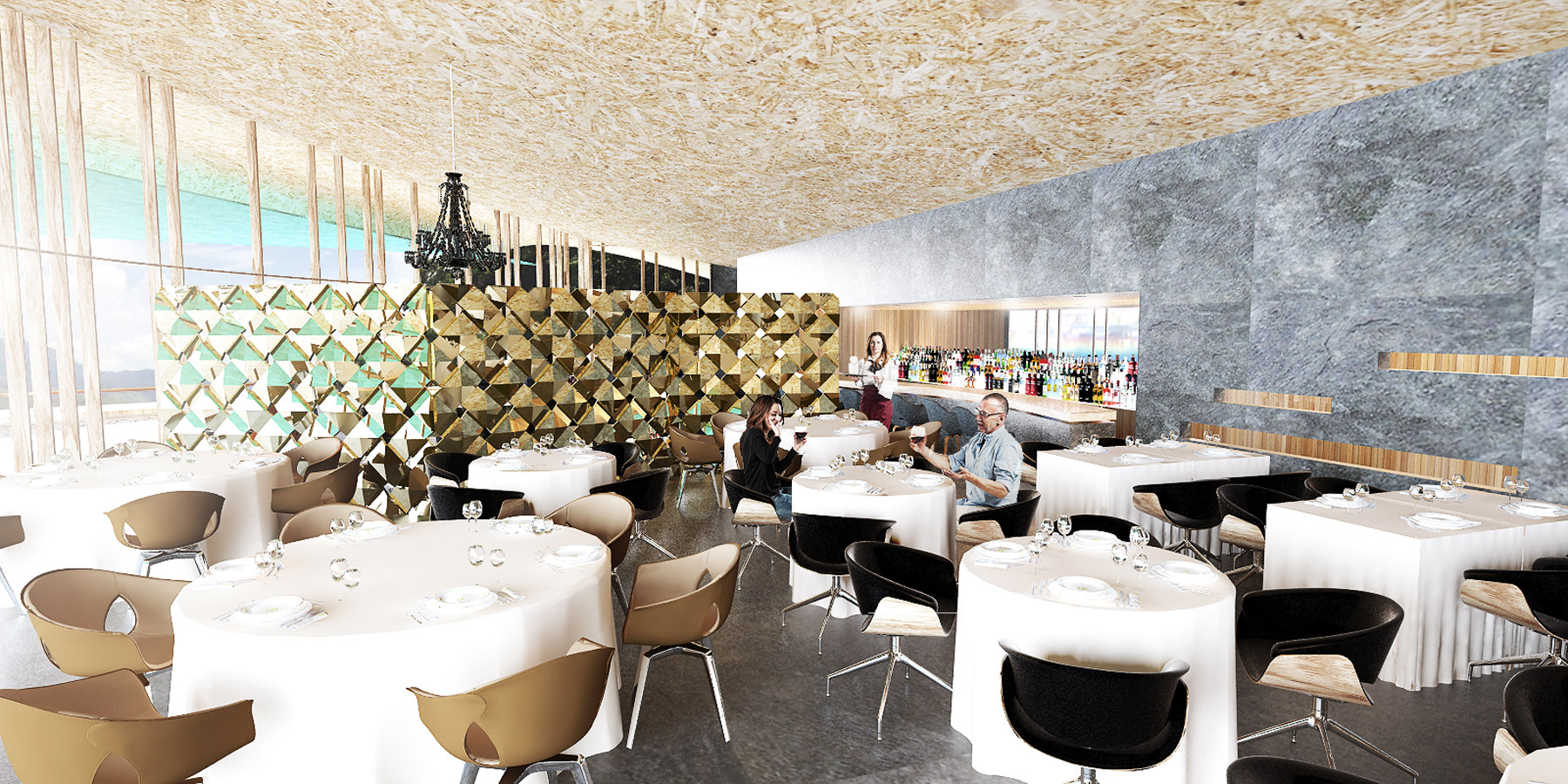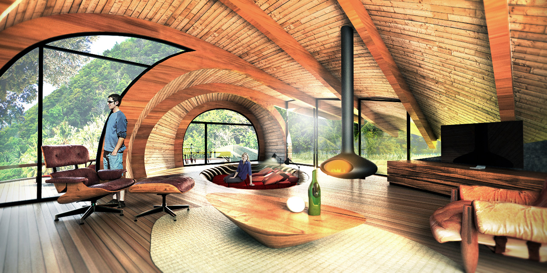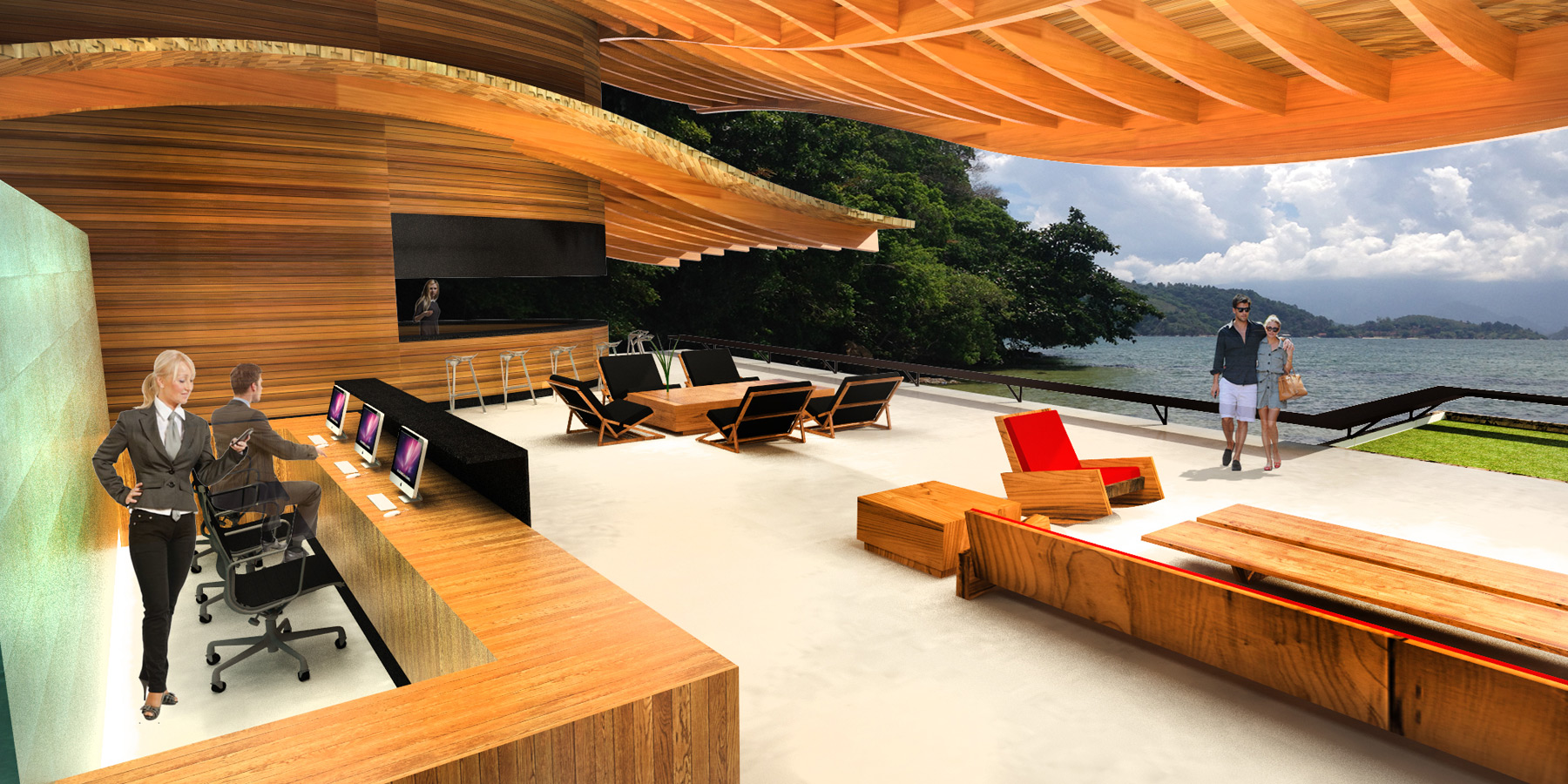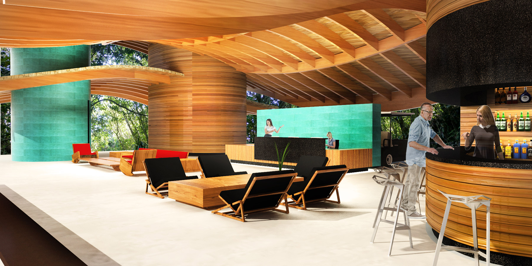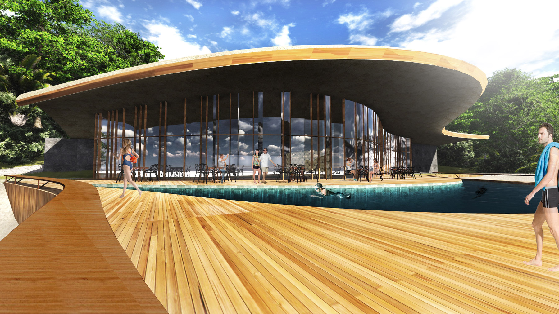 The pier is prepared to collect and send to a tratment plant all boats sewage, and naturally leads to the welcome pavillion from where electric golf carts depart to all of the islands amenities. In this buiding, as well as all others, we used GLULAM structures for its sustainable quality, salty breeze resistance and formal versatility.