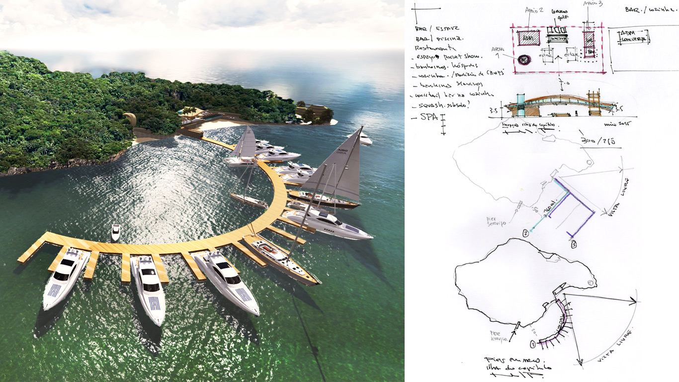 The resort called ILHA DO CAPÍTULO is a development destined to serve as a support and amenities structure on land for big yatch owners at Angra dos Reis, Rio de Janeiro’s south coast. A floating pier takes the shape of an arc to keep unobstructed views from the small beach close to the reception pavillion and is capable of receiving 20 boats up to 80 feet.
