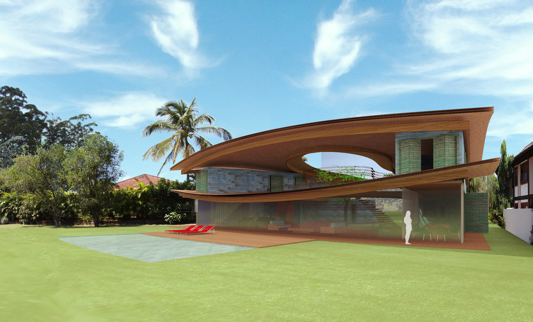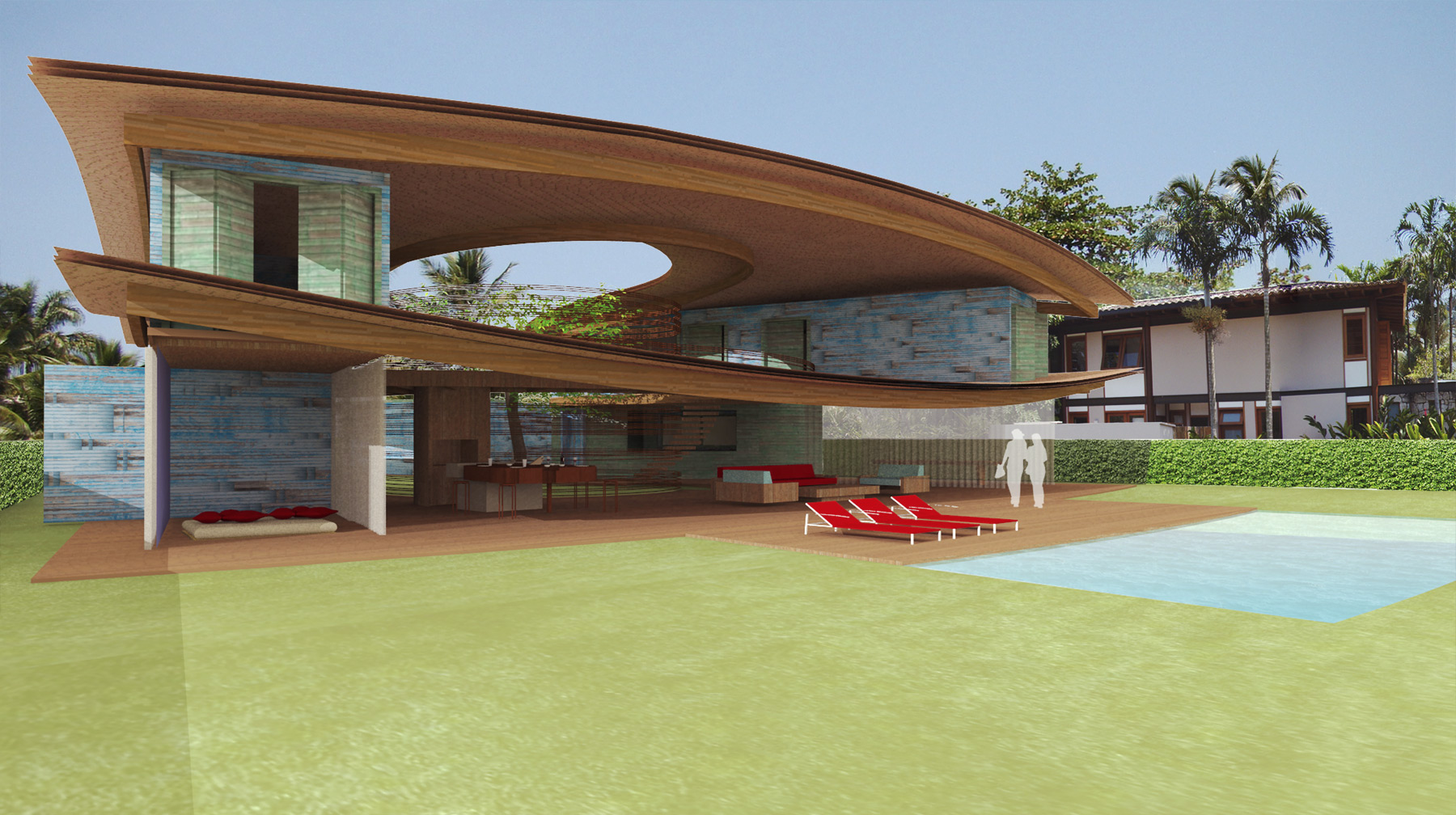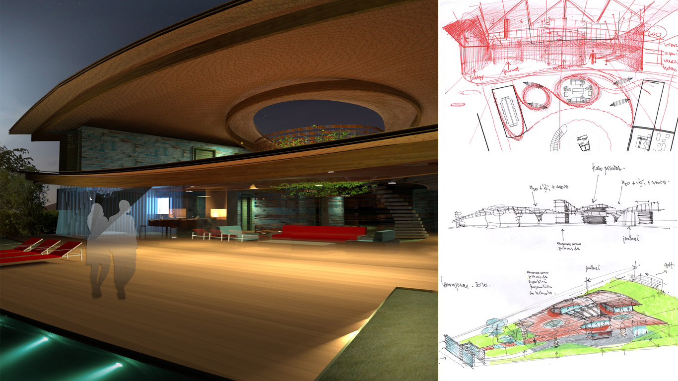 The Laranjeiras develpment in Paraty, Rio de Janeiro has three types of plots: The ones in front of the beach, the ones that face a marina ant the ones that face a golf course. We had to tackle this last situation where the the plot has the shape of a slice of pizza. This led to a peculiar situation where we designed a tropical beach house facing a golf course and hills covered by the native atlantic forest: A beach house with a typical countryside view.