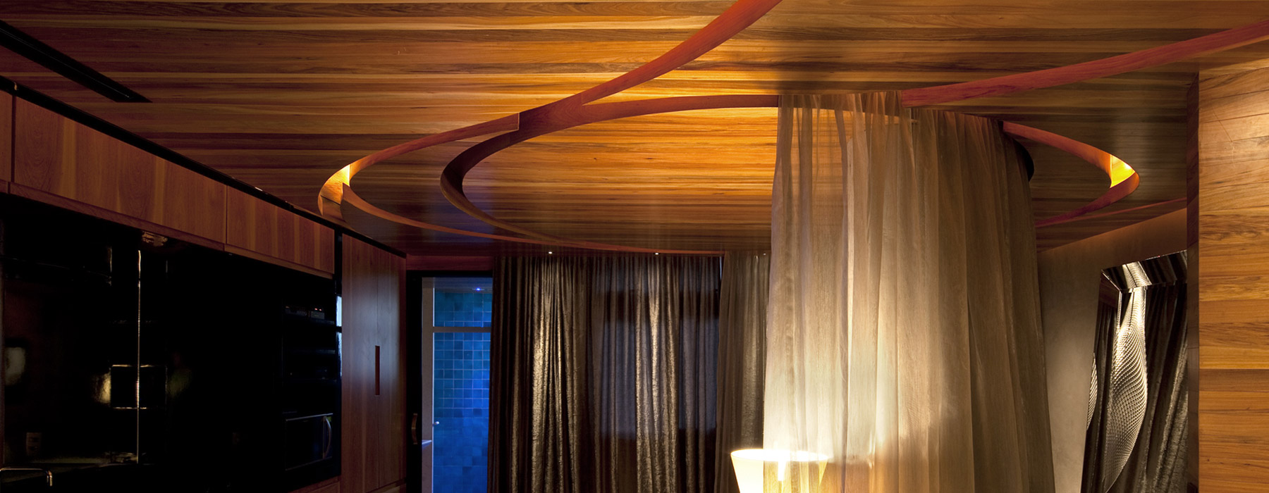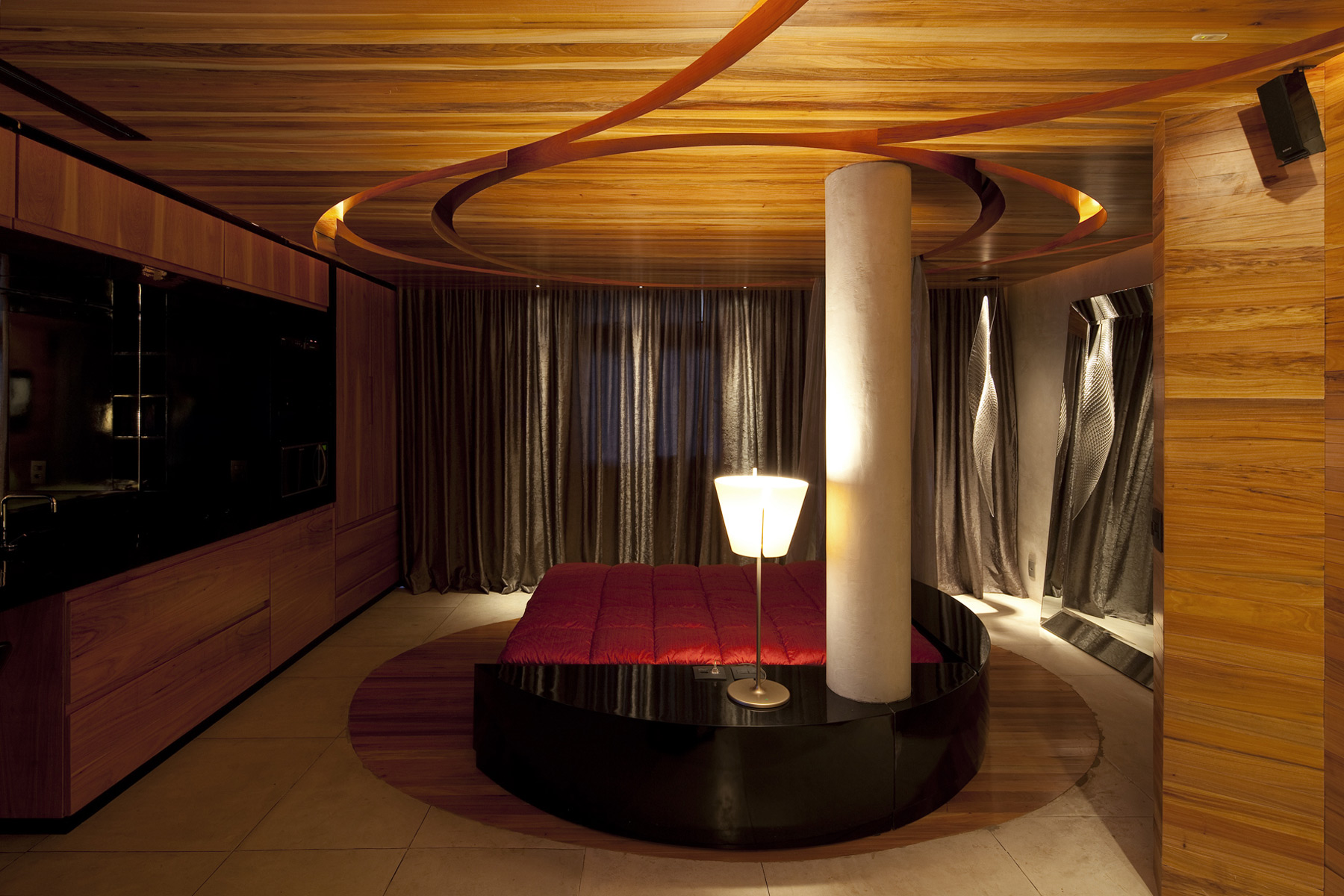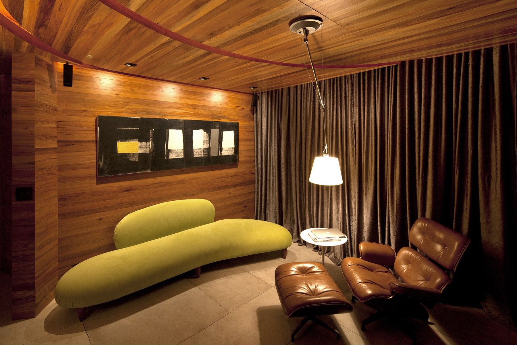 The ceiling´s sinuous bas-reliefs that accommodate curtains and lightning is entirely constructed with solid wood, contrasting with the clear cement flooring. Silk curtains, furniture from icons such as Eames, Saarinen, Noguchi and Lovegrove, together with a beautiful painting from Amilcar de Castro add value to the overall atmosphere. In the heart of the studio lays the bedroom, surrounded by a living/reading/home-theatre space, a long kitchen and a comfortable bathroom.