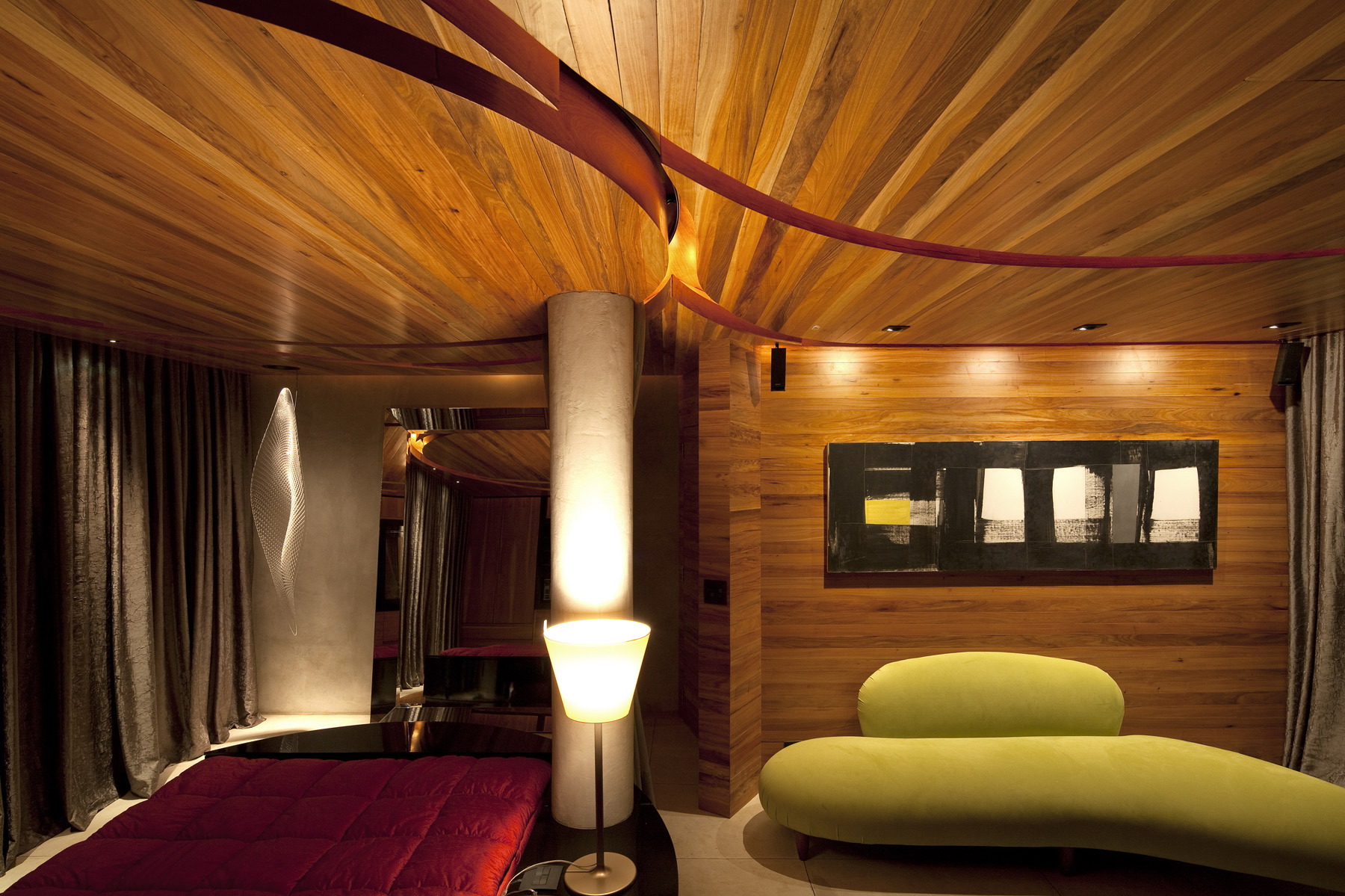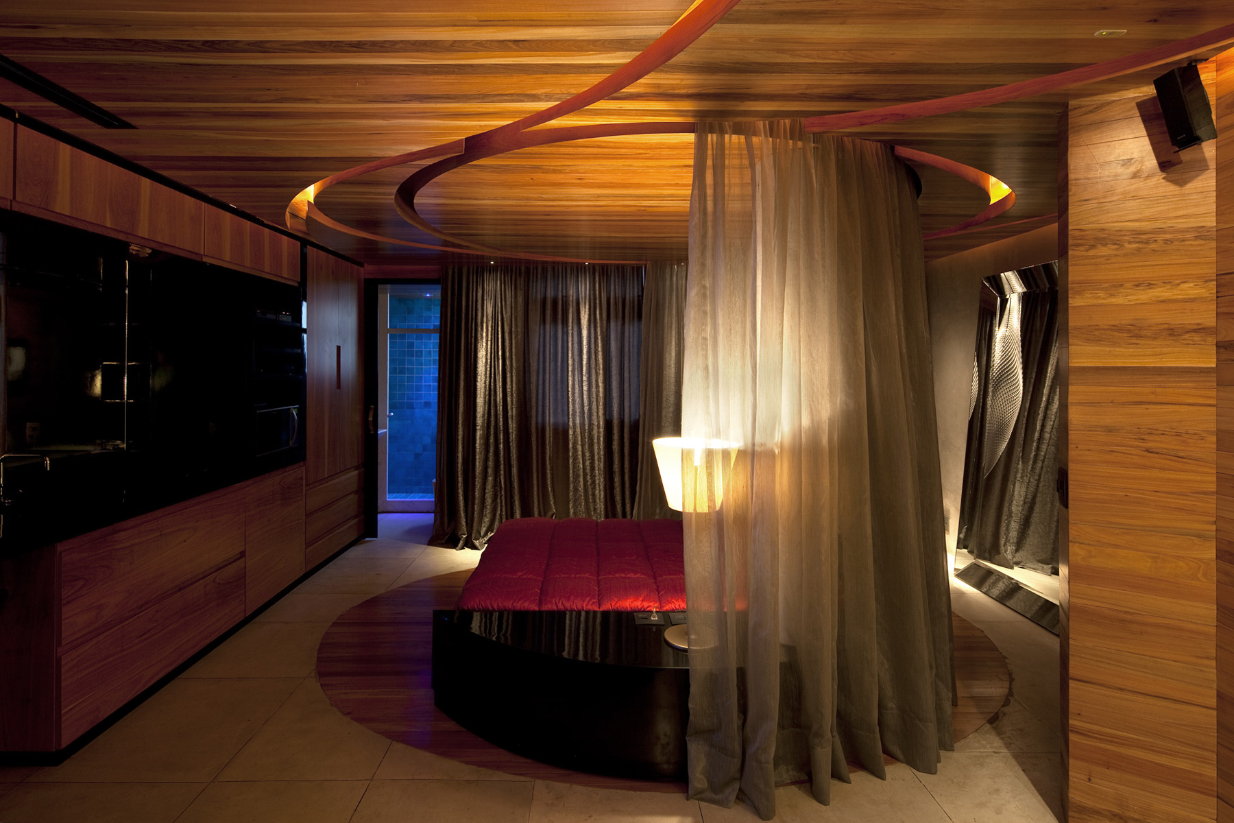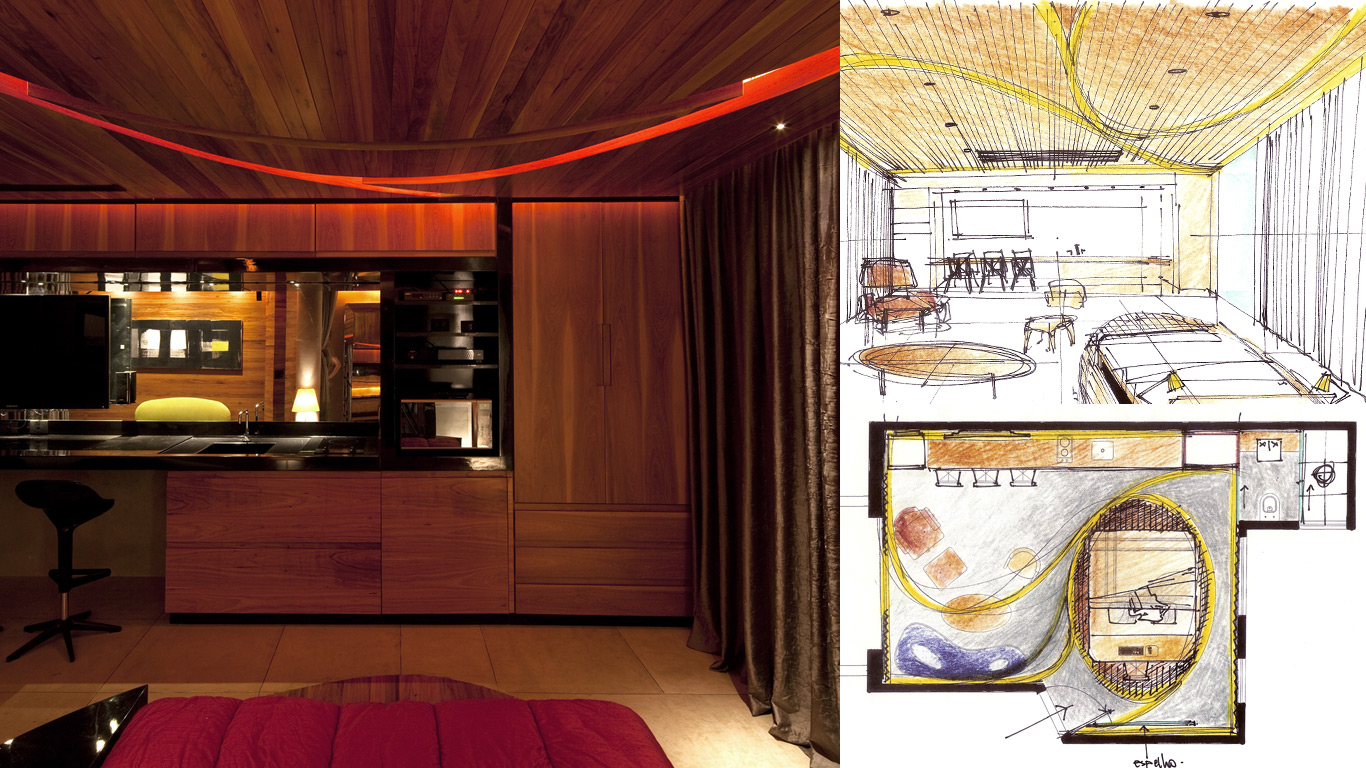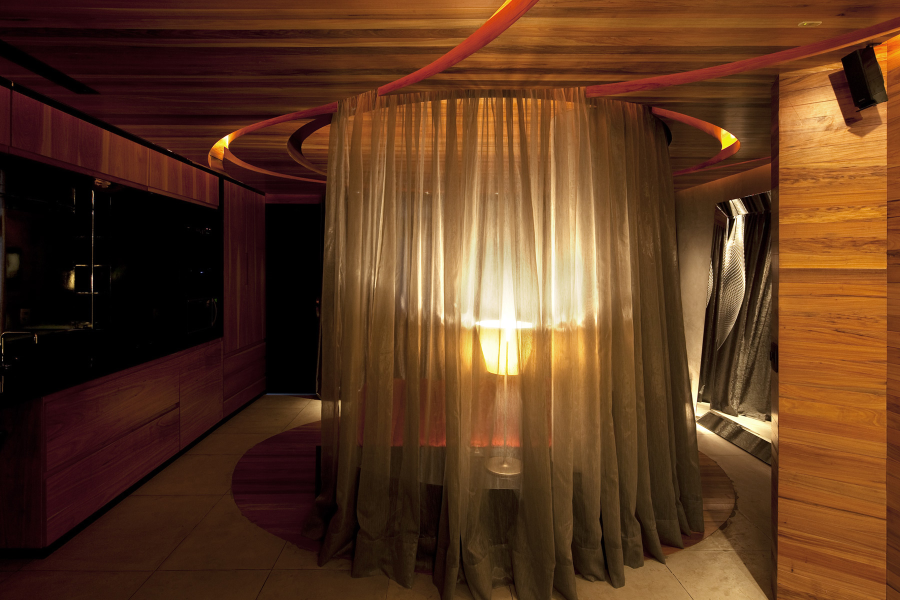 The ceiling´s sinuous bas-reliefs that accommodate curtains and lightning is entirely constructed with solid wood, contrasting with the clear cement flooring. Silk curtains, furniture from icons such as Eames, Saarinen, Noguchi and Lovegrove, together with a beautiful painting from Amilcar de Castro add value to the overall atmosphere. In the heart of the studio lays the bedroom, surrounded by a living/reading/home-theatre space, a long kitchen and a comfortable bathroom.