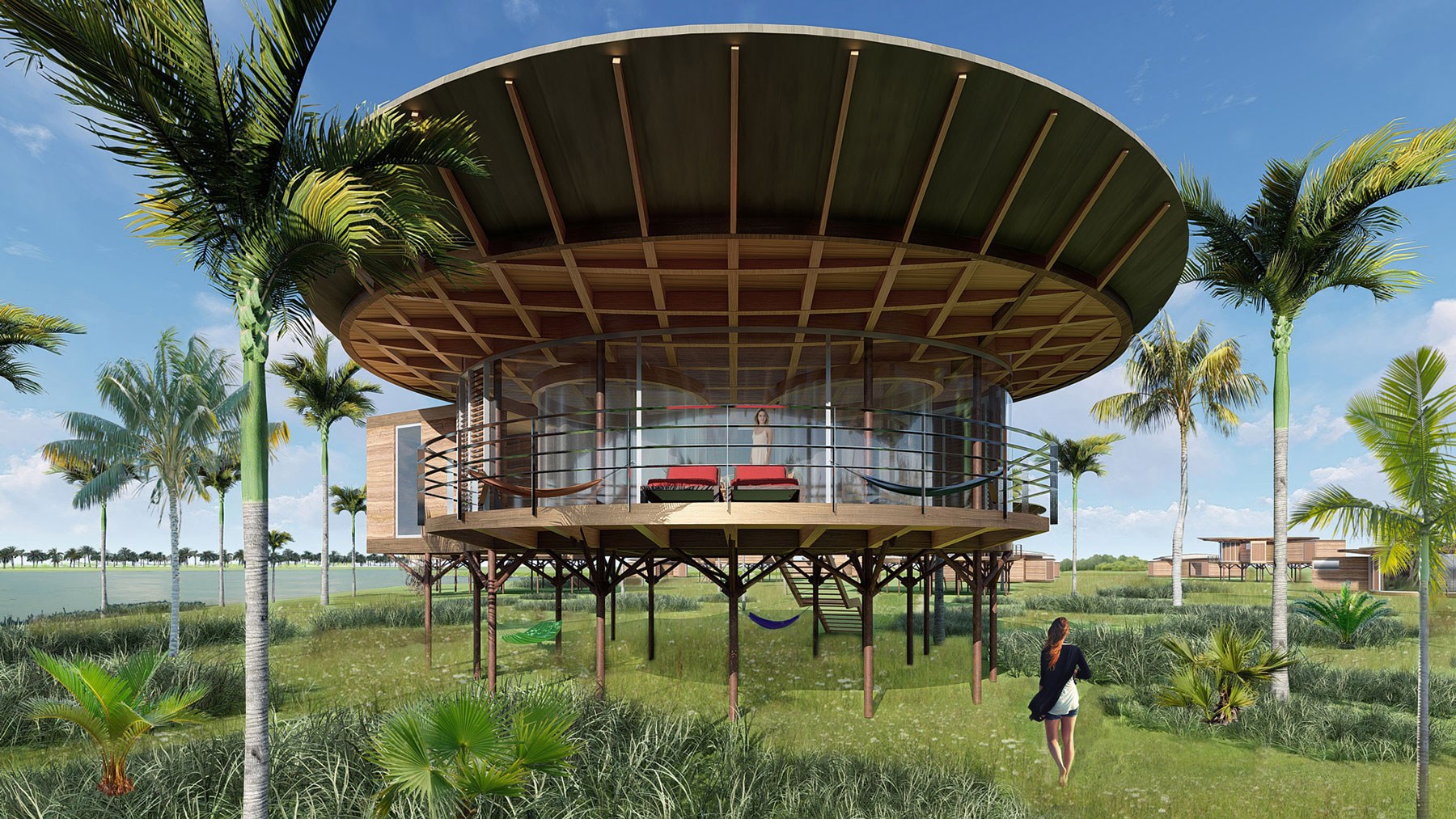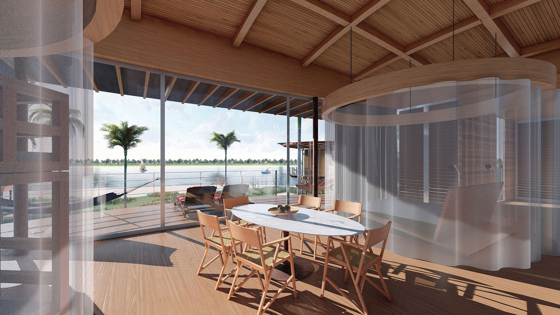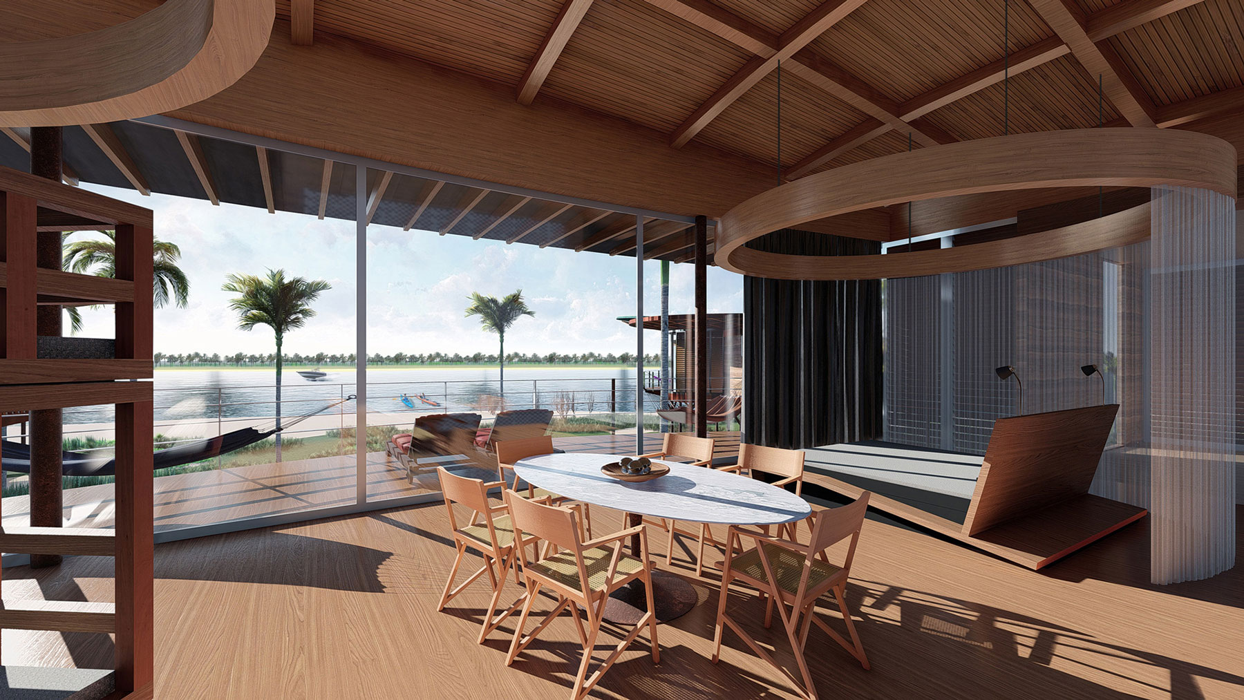 A bangalow with full amenities for guests is the idea behind this design. An elliptical focal space, 50 square metres in area contains a custom designed couple’s bed with desk , a dining table for 6 people and access to complementary areas such as a generous verandah protected by the roof´s big overhang. A complementary space with bathroom and another one with a living/tv/kitchen are boxy for optimal practical use and the overall composition follow the concept of service and serviced areas.