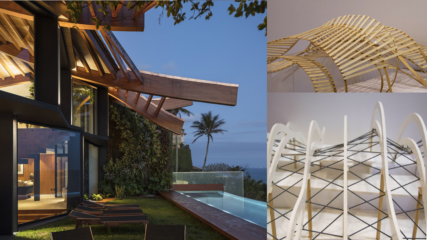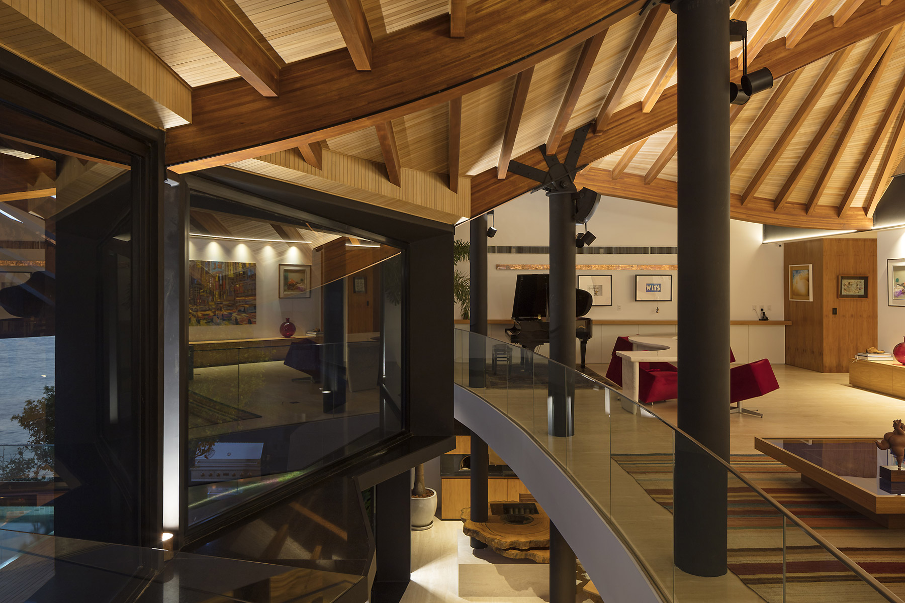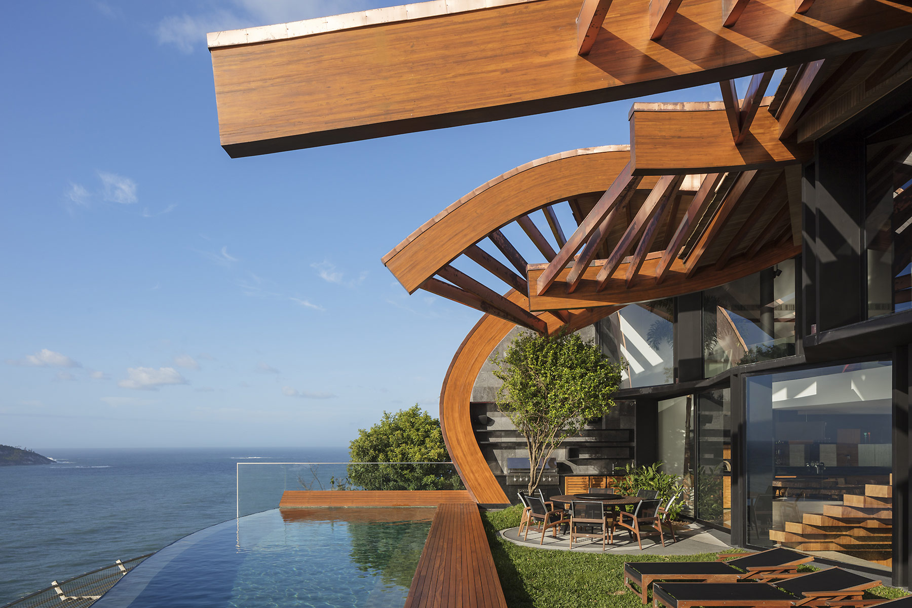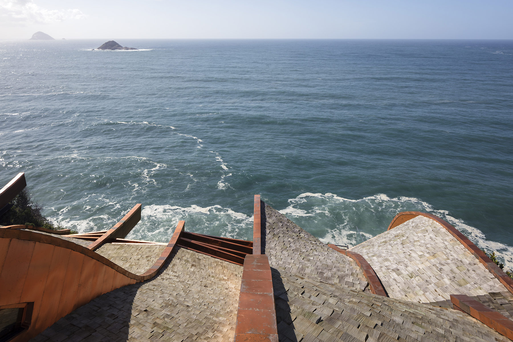 E só se ouve o mar e os ventos. E os pássaros. O agradável choque dos cascos dos barcos com as ondas. É como se a casa fosse uma nave cortando as ondas em busca do horizonte. E foram essas ondas que serviram de inspiração para o desenho da cobertura que protege a construção do inclemente sol carioca. A geometria complexa da cobertura coberta com taubilhas de pinus é gerada por grandes vigas curvas de madeira laminada de eucalipto. Essas vigas são apoiadas sobre pilares de seção circular em aço galvanizado. Devido ao grande programa proposto pelos clientes, a relativa estreiteza do terreno, e os altos muros vizinhos, resolvemos estender a planta da casa de vizinho a vizinho e criar aberturas para a frente (rua de acesso ) e para os fundos (mar) do terreno.