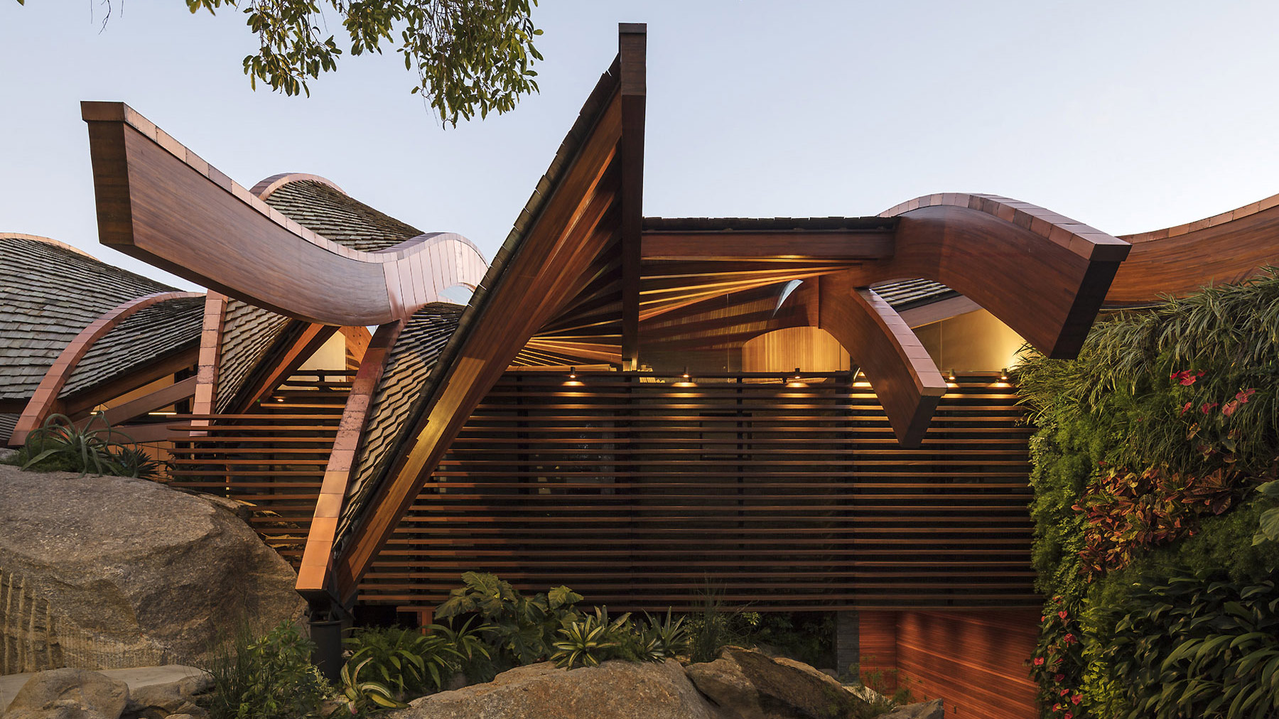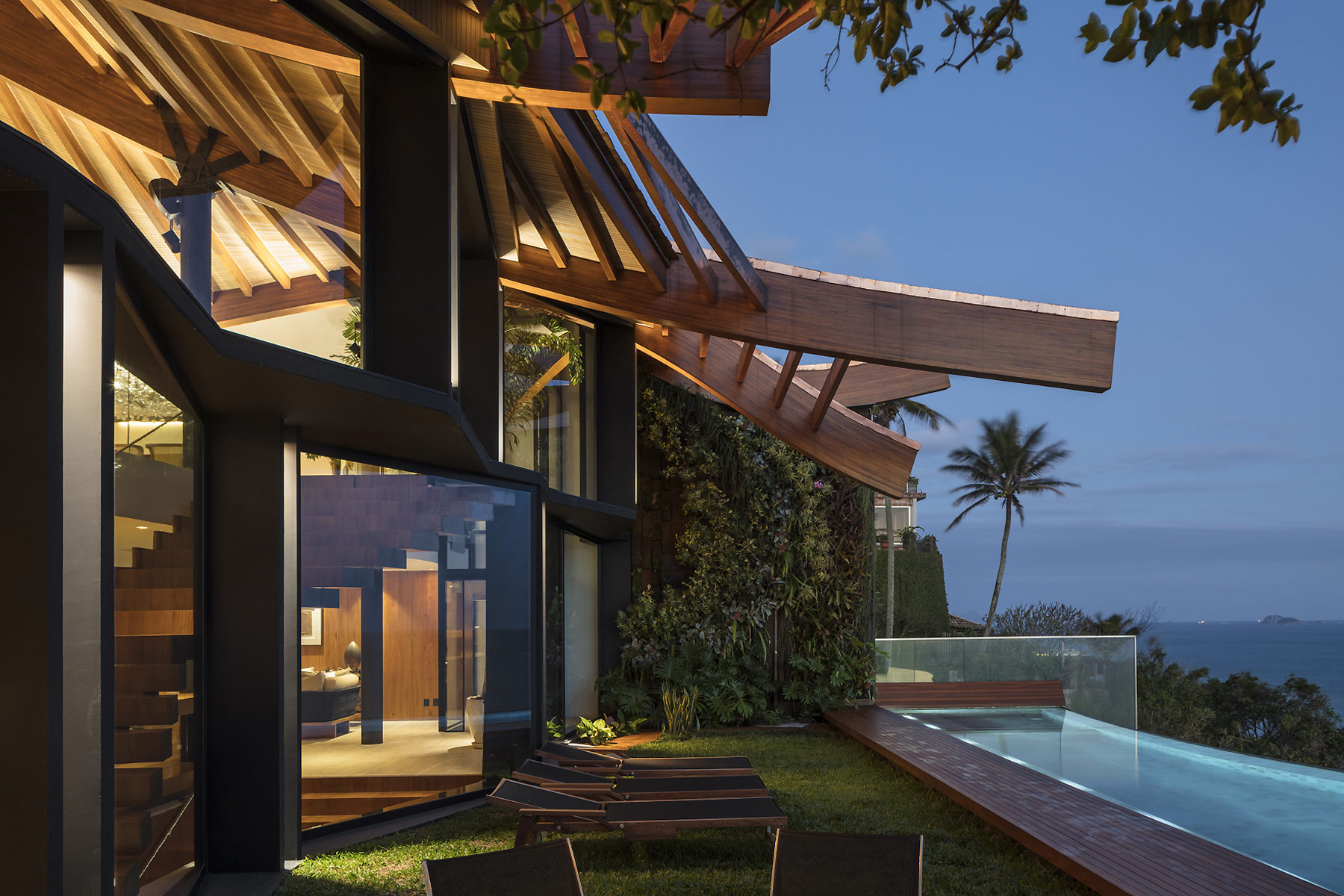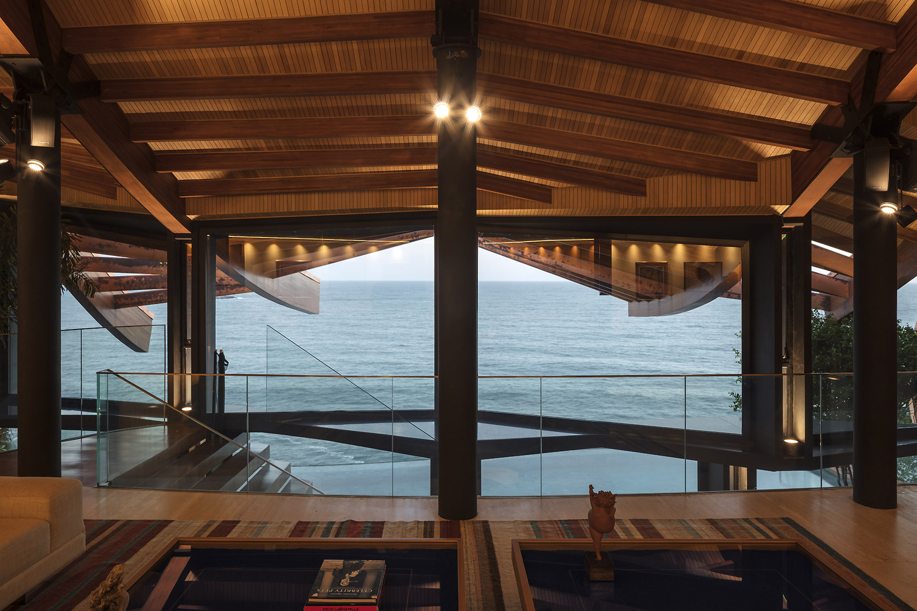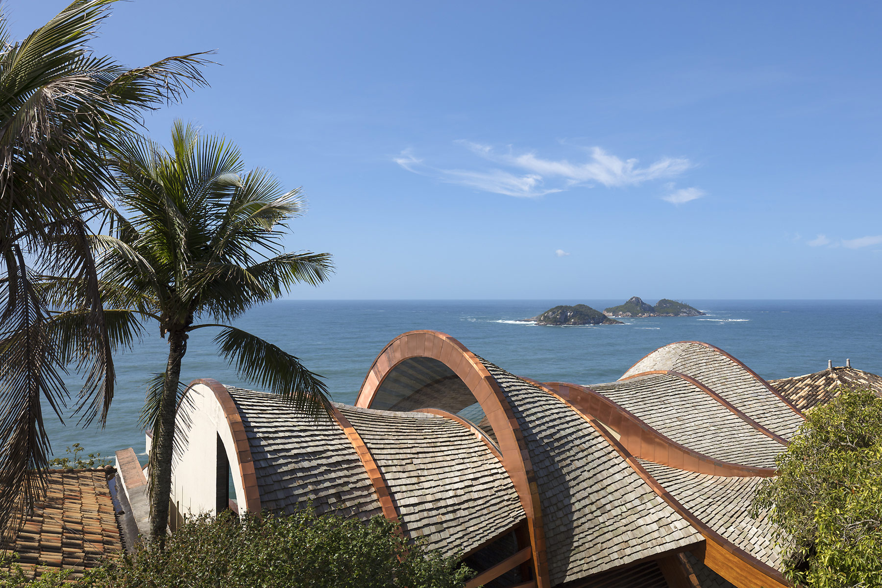 E só se ouve o mar e os ventos. E os pássaros. O agradável choque dos cascos dos barcos com as ondas. É como se a casa fosse uma nave cortando as ondas em busca do horizonte. E foram essas ondas que serviram de inspiração para o desenho da cobertura que protege a construção do inclemente sol carioca. A geometria complexa da cobertura coberta com taubilhas de pinus é gerada por grandes vigas curvas de madeira laminada de eucalipto. Essas vigas são apoiadas sobre pilares de seção circular em aço galvanizado. Devido ao grande programa proposto pelos clientes, a relativa estreiteza do terreno, e os altos muros vizinhos, resolvemos estender a planta da casa de vizinho a vizinho e criar aberturas para a frente (rua de acesso ) e para os fundos (mar) do terreno.