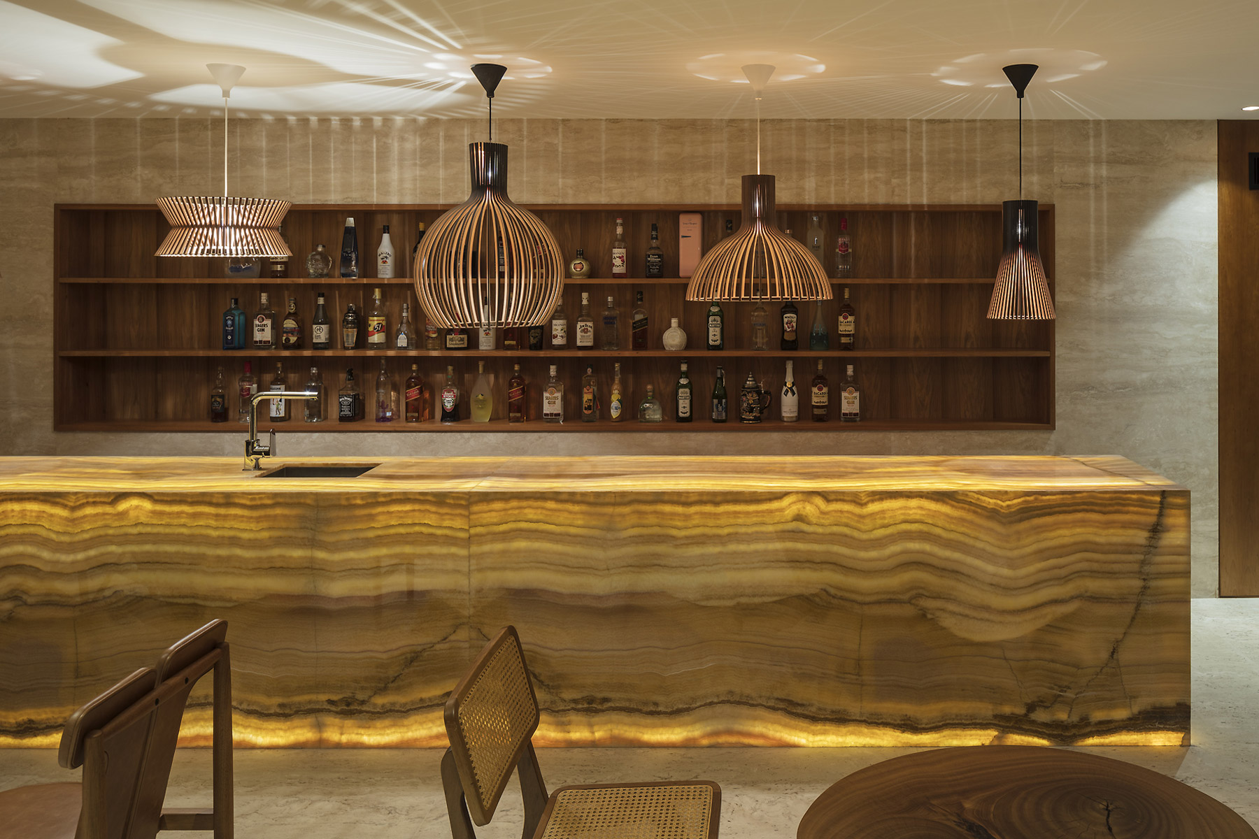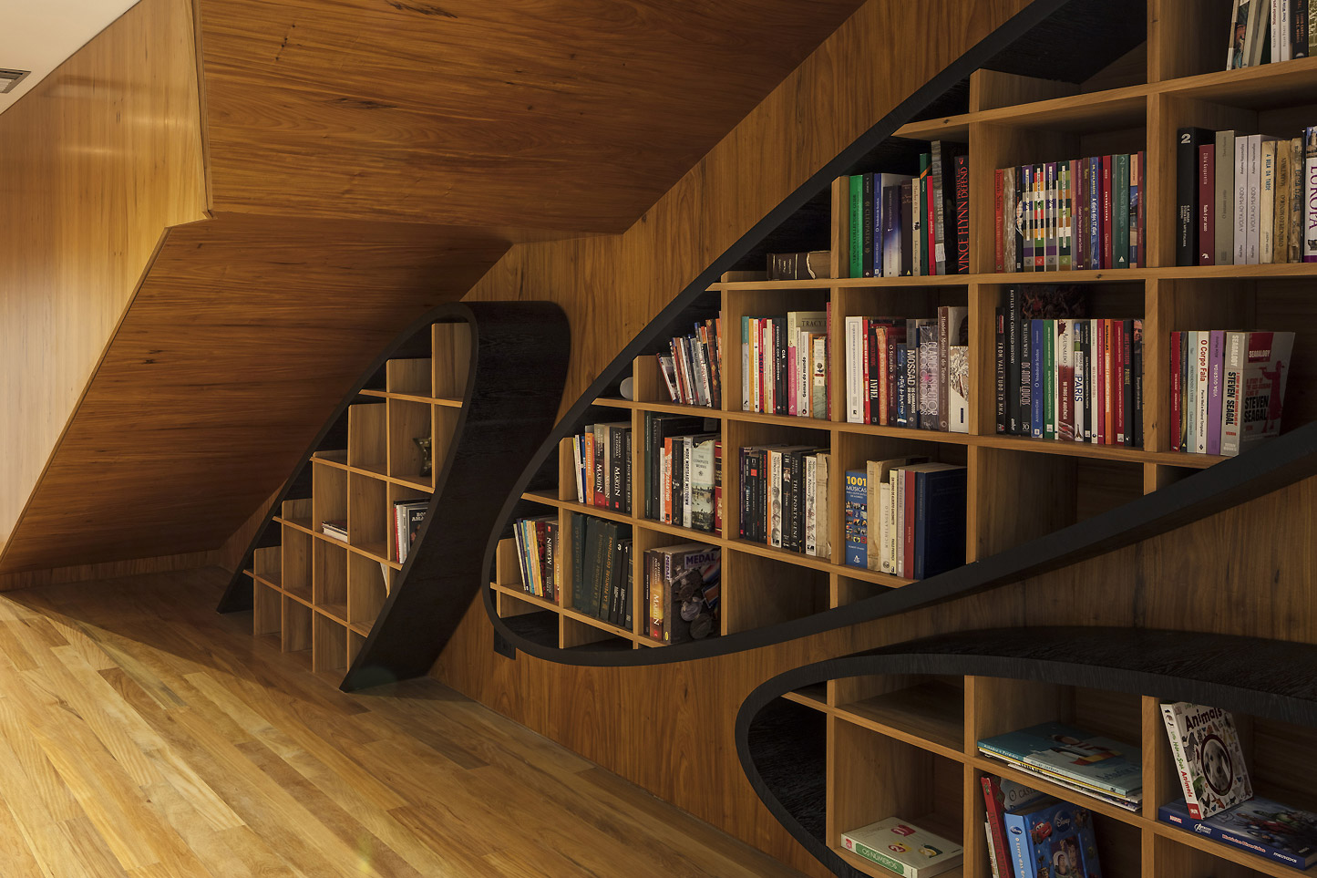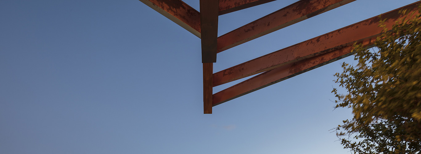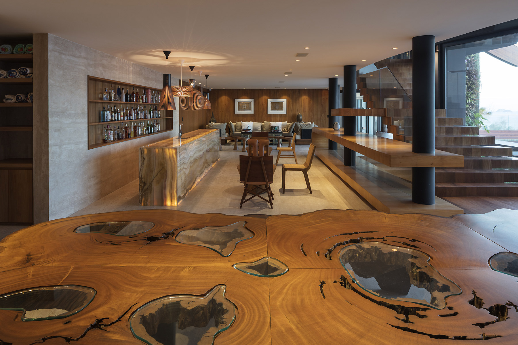 E só se ouve o mar e os ventos. E os pássaros. O agradável choque dos cascos dos barcos com as ondas. É como se a casa fosse uma nave cortando as ondas em busca do horizonte. E foram essas ondas que serviram de inspiração para o desenho da cobertura que protege a construção do inclemente sol carioca. A geometria complexa da cobertura coberta com taubilhas de pinus é gerada por grandes vigas curvas de madeira laminada de eucalipto. Essas vigas são apoiadas sobre pilares de seção circular em aço galvanizado. Devido ao grande programa proposto pelos clientes, a relativa estreiteza do terreno, e os altos muros vizinhos, resolvemos estender a planta da casa de vizinho a vizinho e criar aberturas para a frente (rua de acesso ) e para os fundos (mar) do terreno.