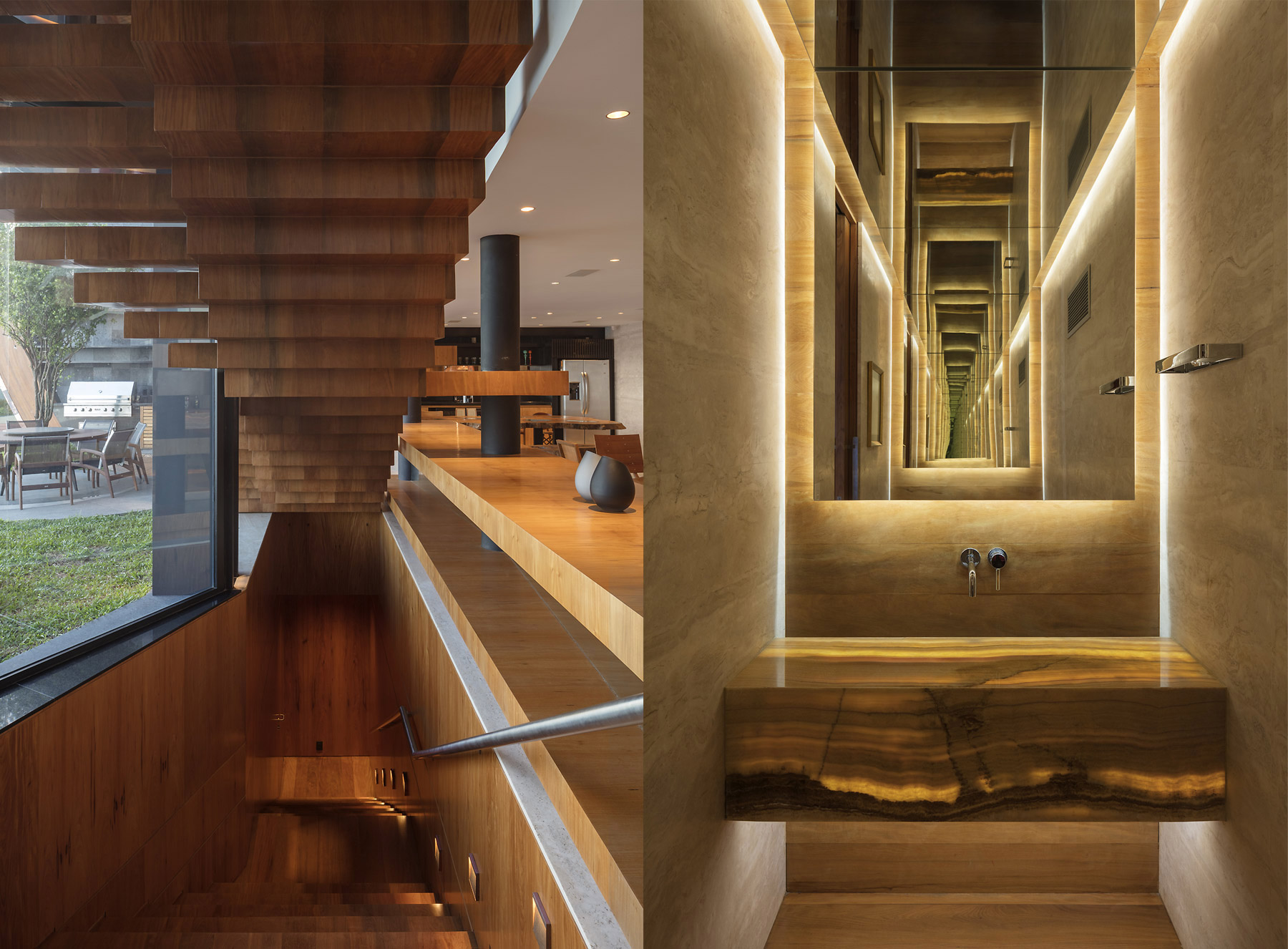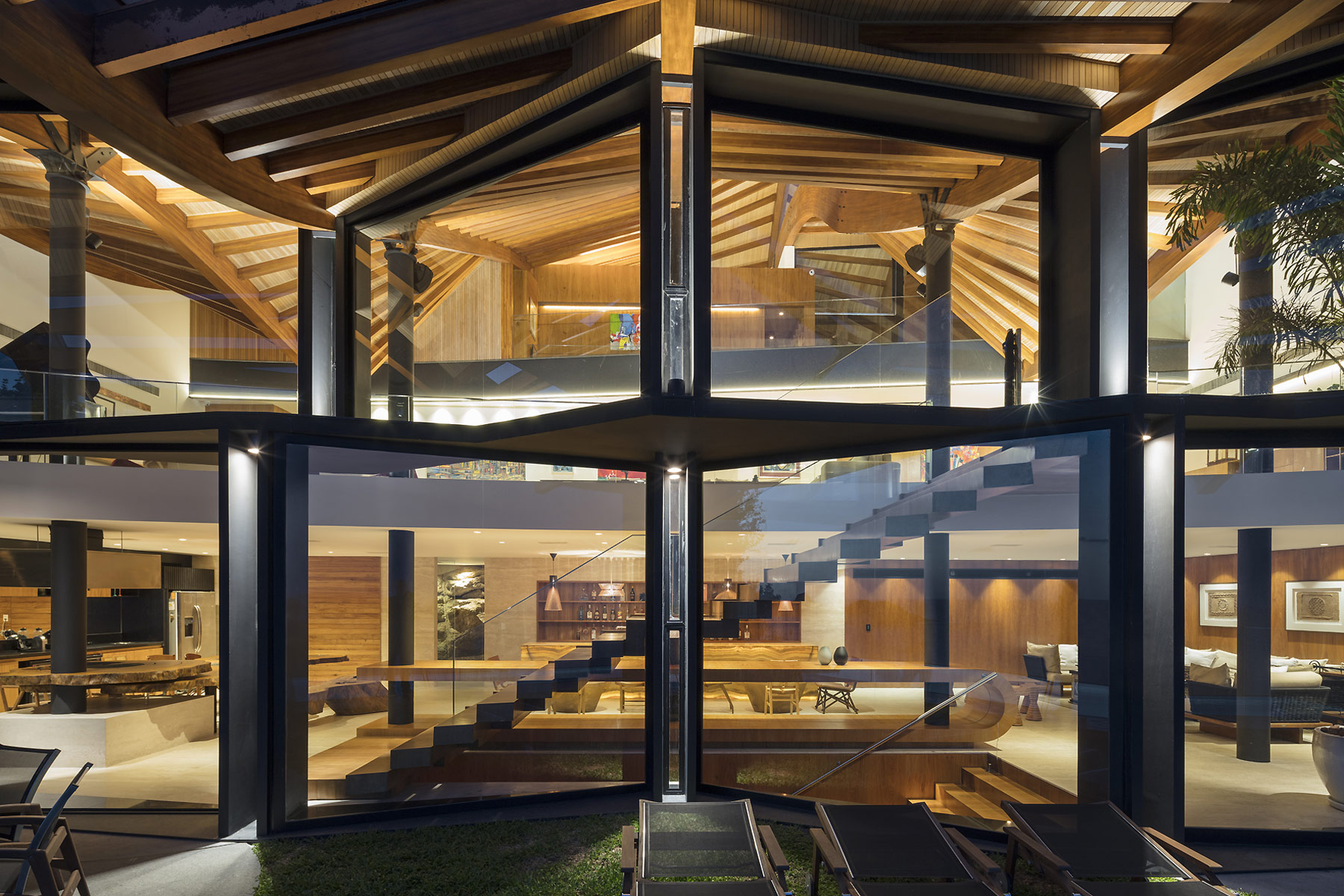 A casa se desenvolve em quatro andares acessíveis por escadas e um elevador com pistão hidráulico em vidro. O nível de acesso conta com a área de serviço, cozinha e sala de estar/jantar. O nível imediatamente acima tem quartos para empregados, quarto de hóspedes e sala de televisão. O nível inferior ao de acesso é o contato direto com a natureza. Uma piscina sinuosa de borda infinita separa o mar do jardim gramado. Temos ainda uma árvore ( pé de acerola ) e um grande jardim vertical. Um amplo salão com área gourmet, estar, bar, sauna e vestiário completam o andar. Descendo mais um lance de escadas chega-se ao andar íntimo e suas três suítes, Family room e brinquedoteca.