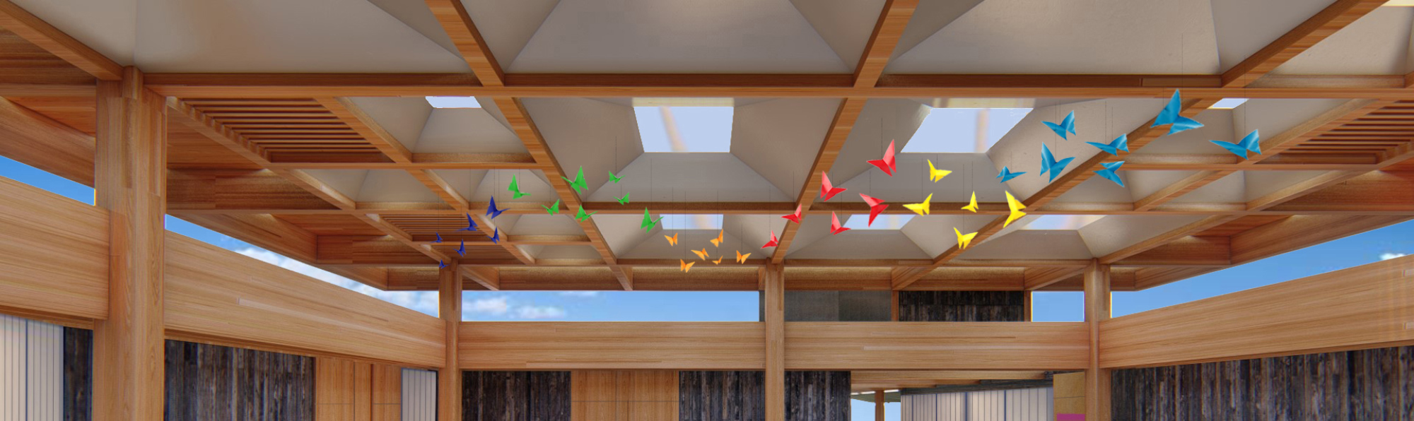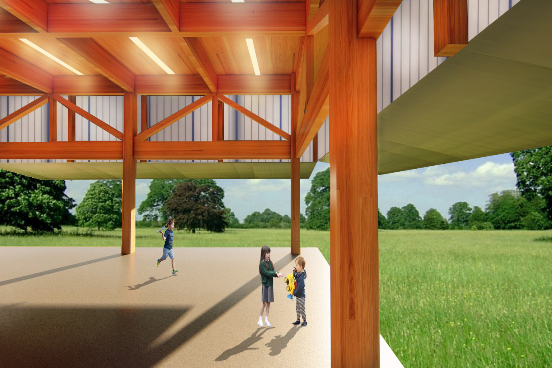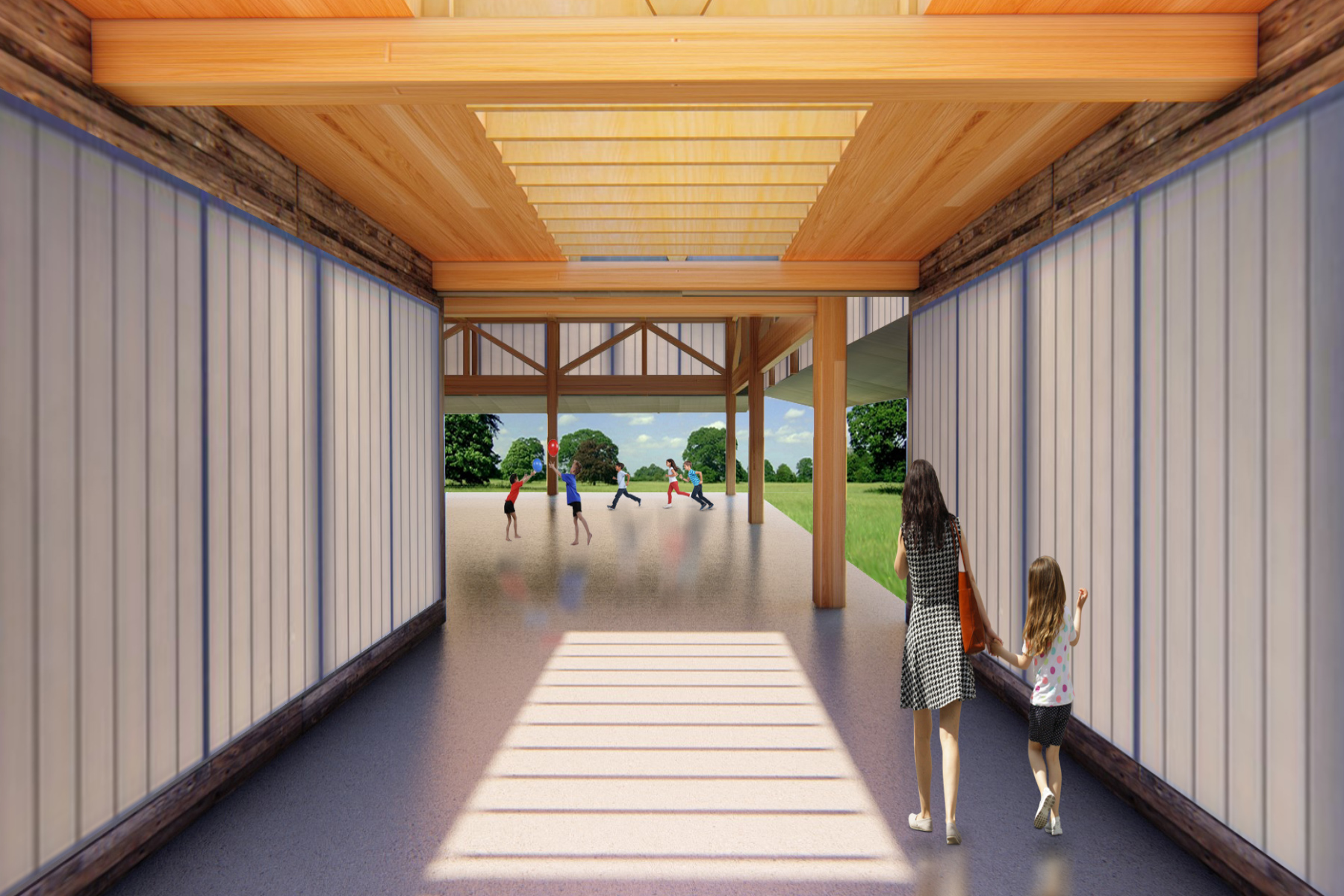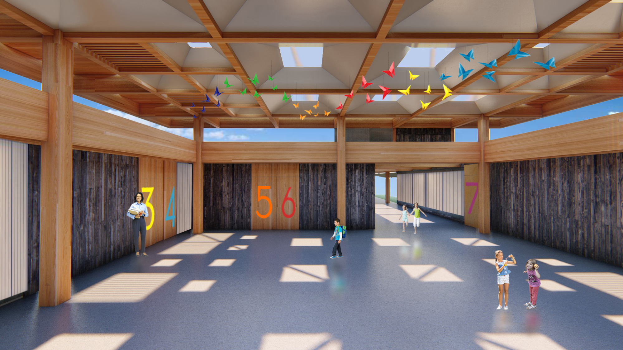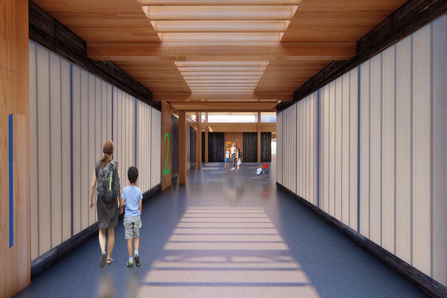 Todas as circulações entre prédios, o existente pátio central e o espaço em frente ao refeitório; todos esses espaços serão cobertos 100% por estruturas de madeira laminada de eucalipto aparafusadas. Fechamentos verticais serão feitos em painéis estruturados de policarbonato. Fechamentos horizontais de cobertura serão feitos ora em telhas especiais de policarbonato, ora em painéis de madeira com isolamento térmico em lã de rocha. Uma nova estrutura em madeira laminada treliçada e policarbonato será adicionada ao pequeno prédio existente de recepção de forma a receber os alunos protegidos do sol e da chuva.