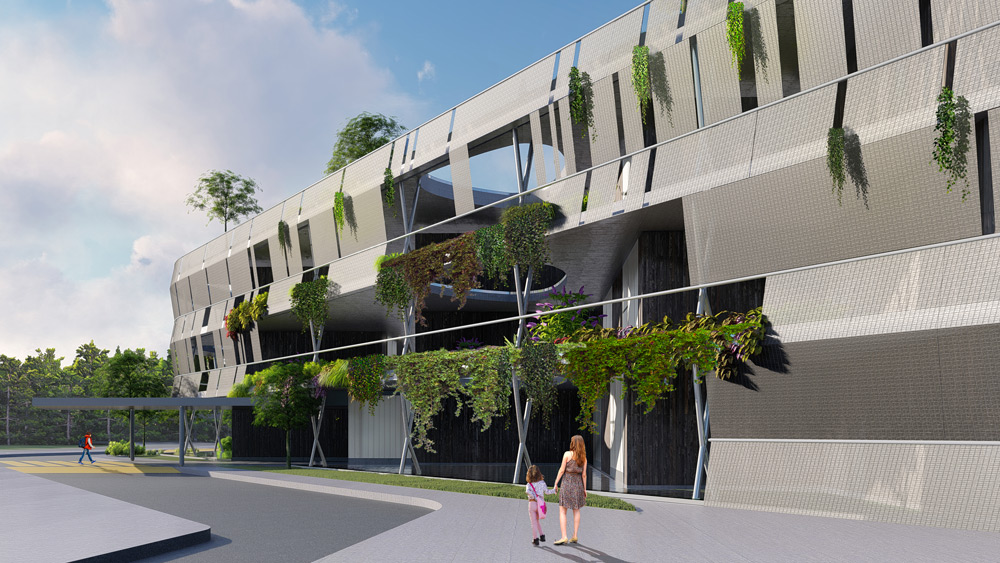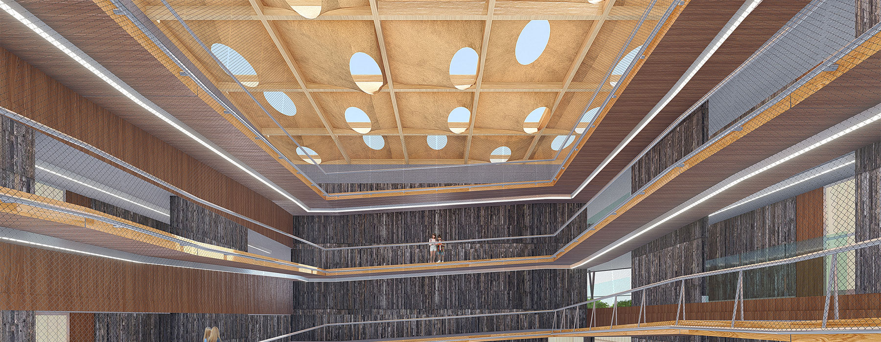 A circulação vertical rampeada se desenvolve ao longo de um átrio de três andares de altura que é inundada pela luz natural do sol filtrada por um pergolado fotovoltaico e suavizada através de cúpulas. Os painéis fotovoltaicos, além de gerar energia desempenha forte papel didático sobre consumo consciente de energia e valores de sustentabilidade. Esses mesmos valores decidiram o uso extensivo de vegetação por todo o prédio e é mais visível na fachada principal de acesso.