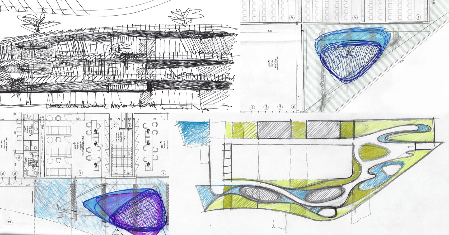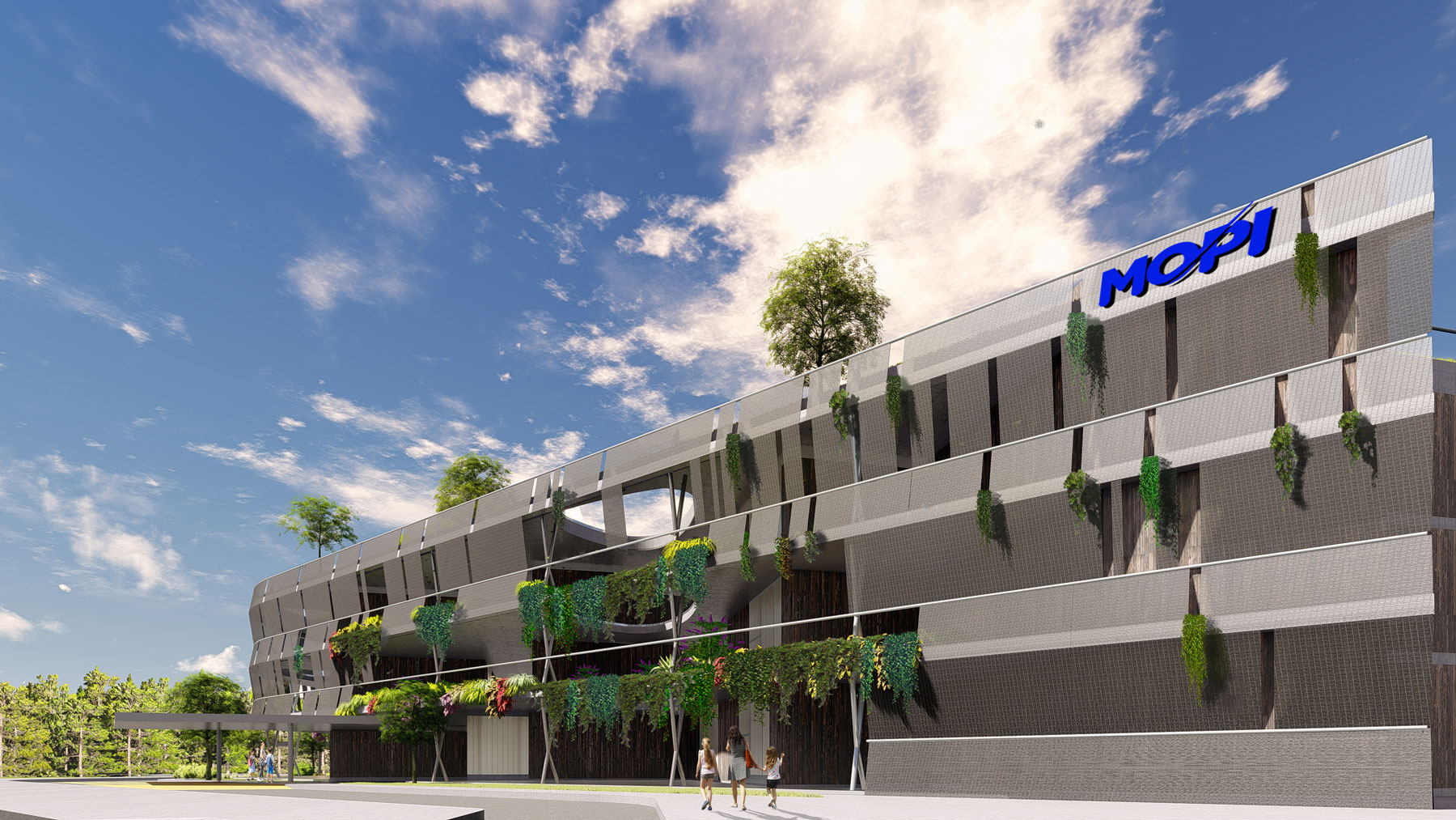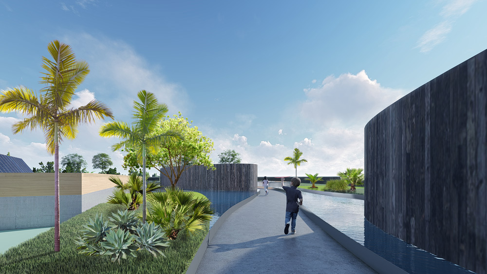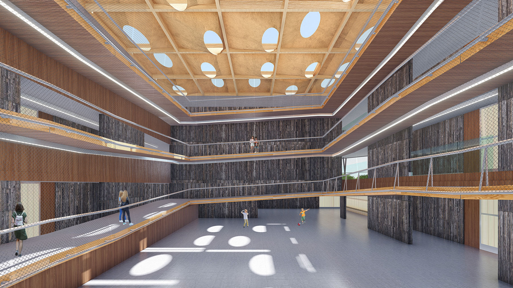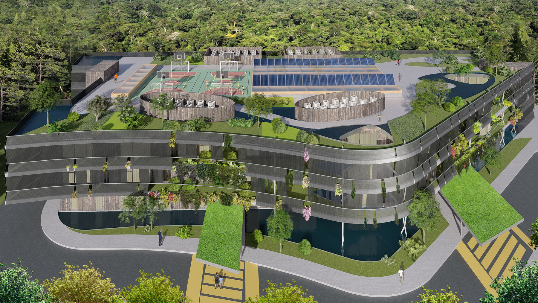A circulação vertical se dá por meio de rampas com 6% de inclinação e garante acessibilidade total a todo o prédio, que conta com jardim suspenso, espelhos d’água e quadras poliesportivas na cobertura, espaço de recreação e contemplação com belas vistas para a reserva natural adjacente.