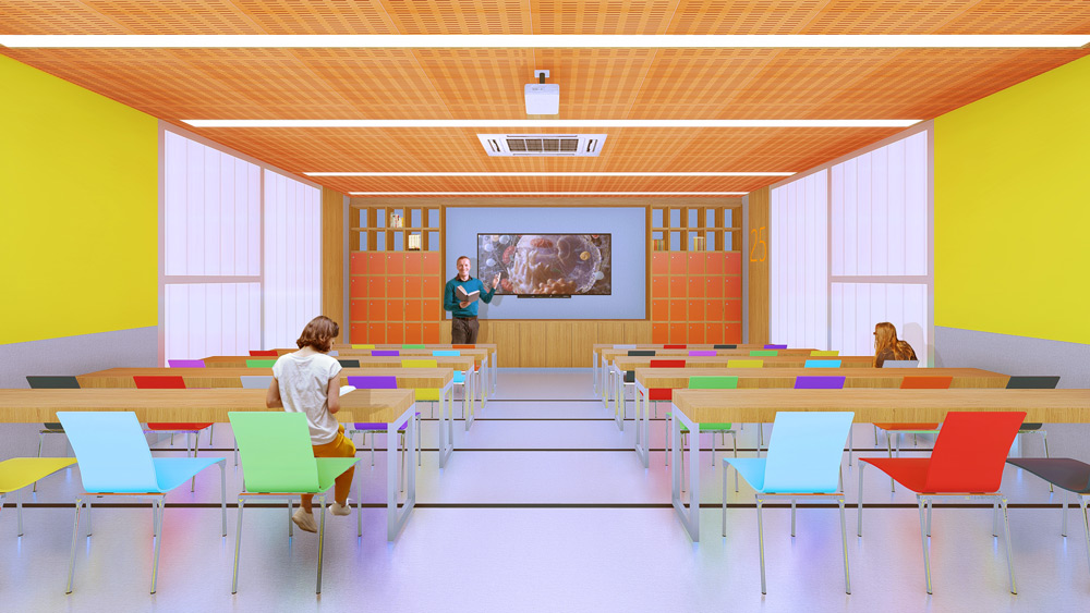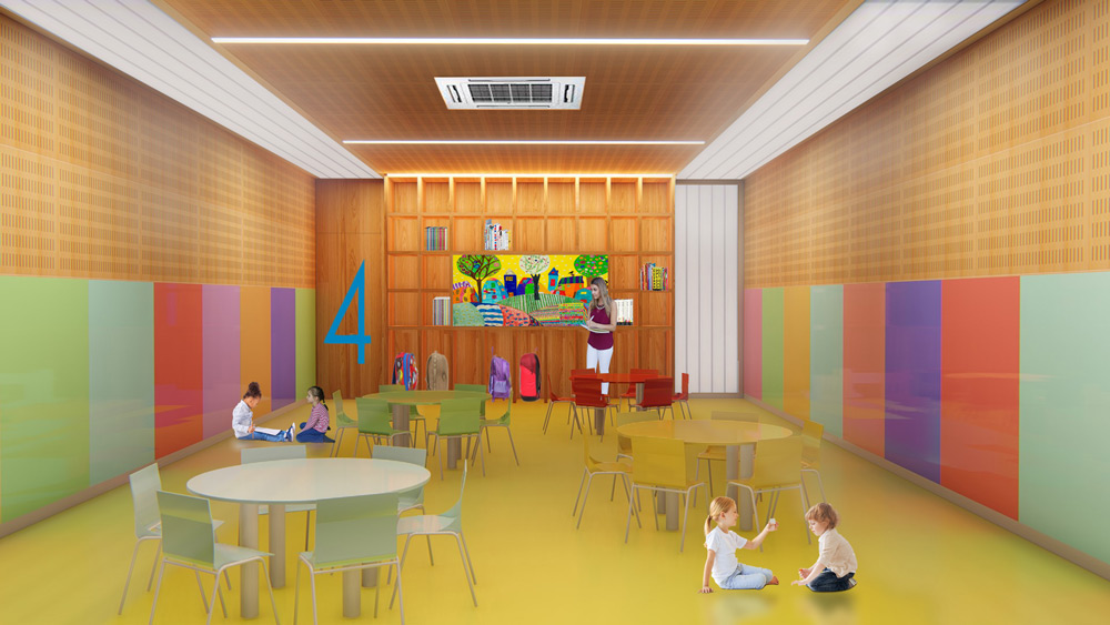 Duas entradas e circulações independentes separam os alunos por idades compatíveis entre si na escola. A primeira se destina aos alunos do ensino infantil, de 3 a 6 anos de idade, e a segunda aos alunos do ensino fundamental e médio, dos 7 aos 17 anos de idade.