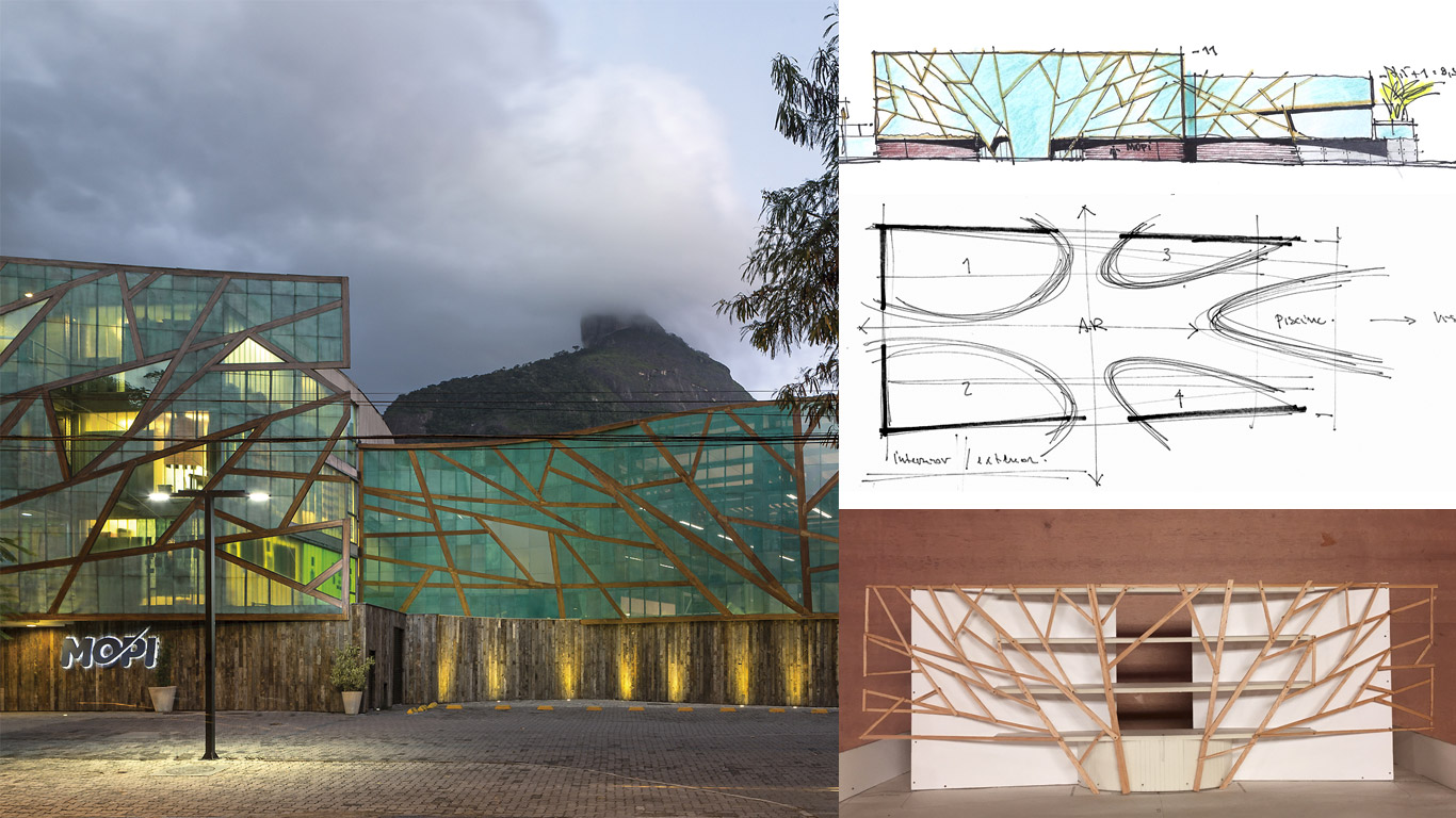 A escola MOPI está localizada em uma área do Rio de Janeiro que, apesar de urbana, é muito arborizada. Foi projetada e construída em três períodos distintos: 2009, 2010 e finalmente 2015. Sua fachada principal está voltada para uma avenida movimentada que conecta as zonas norte e oeste da cidade. O lado oposto do prédio está orientado para a floresta da Tijuca, mais precisamente para a Pedra da Gávea.