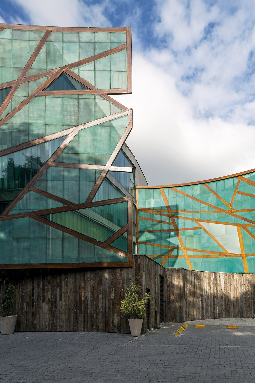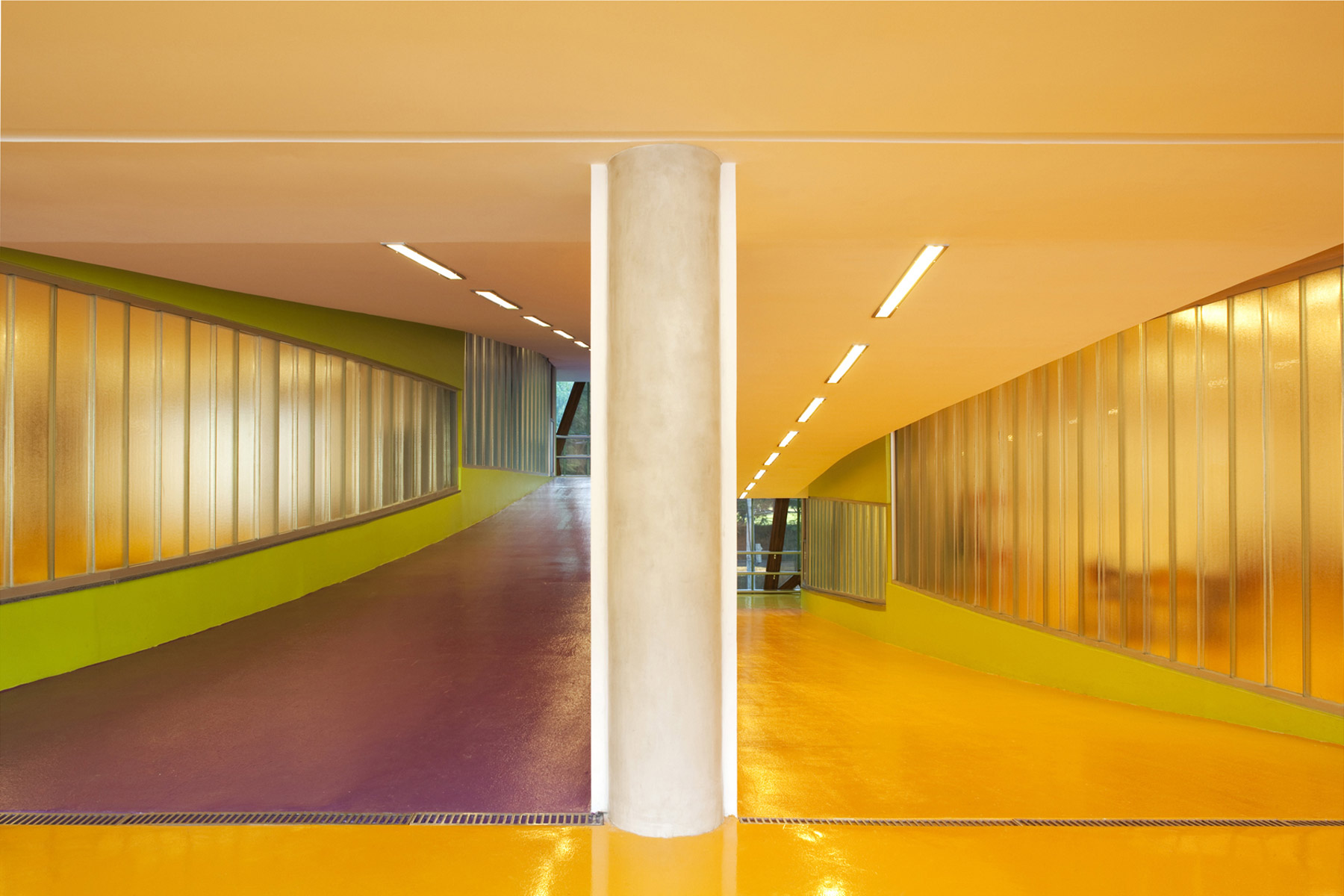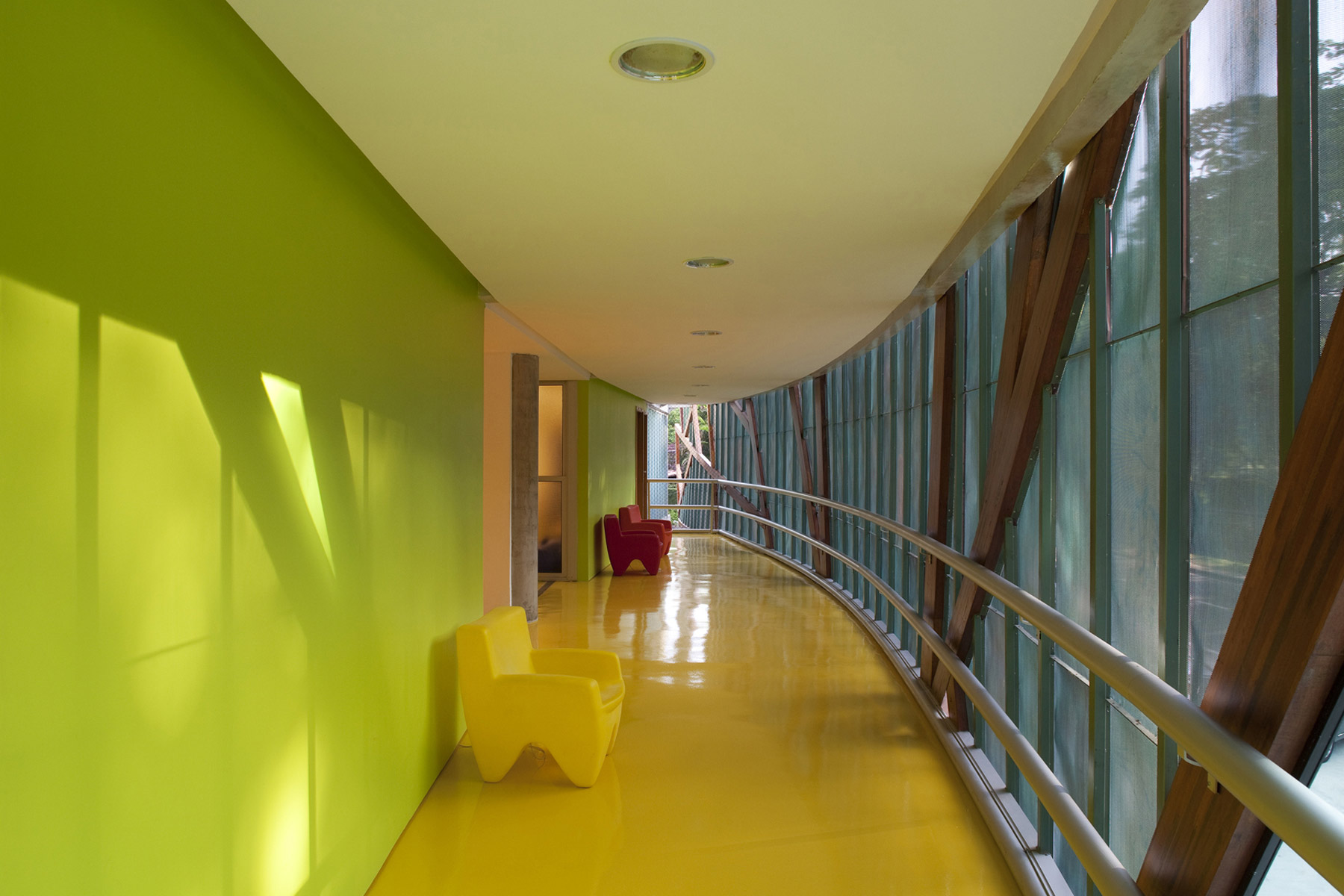 A escola tem acessibilidade total pelo uso de rampas. Vidros translúcidos duplos são usados como fechamento para as salas de aula e as inundam com luz natural sem distrair os alunos. A fachada principal evoca a onipresente floresta na forma de abstração de uma árvore, e é composta de painéis de cobre pré-oxidado micro perfuradas presas a uma estrutura em madeira laminada de eucalipto. Essa micro perfuração do cobre permite a passagem do ar filtrando a luz e impedindo a entrada da chuva. Isso permite um jogo de opacidade e transparência da fachada, que durante o dia é opaca quando vista por fora e semi-transparente quando vista por dentro. Durante a noite o prédio adquire uma transparência que permite que o vibrante jogo de cores do interior da escola atravesse a fachada, dando a impressão de que o prédio é um organismo vivo.
