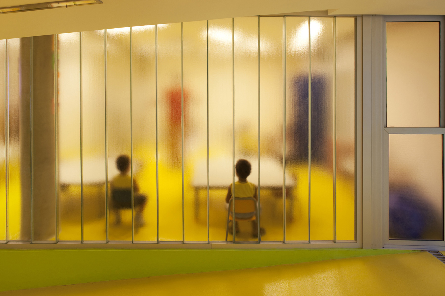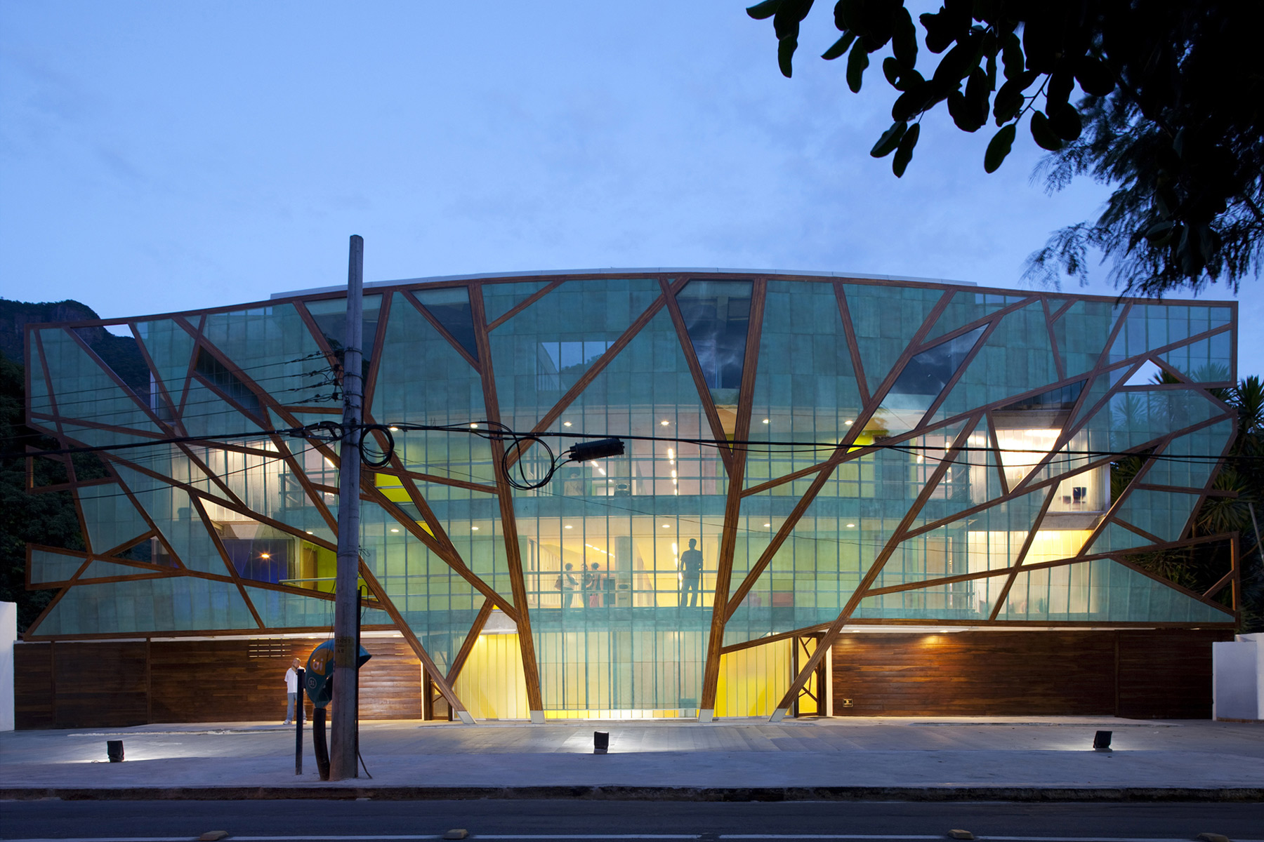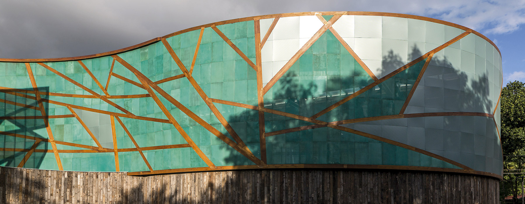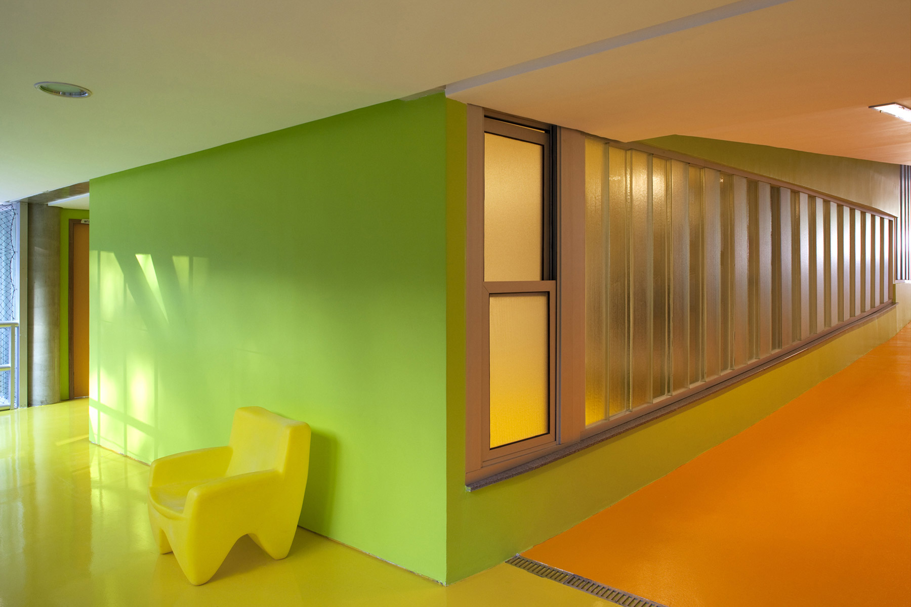 A escola tem acessibilidade total pelo uso de rampas. Vidros translúcidos duplos são usados como fechamento para as salas de aula e as inundam com luz natural sem distrair os alunos. A fachada principal evoca a onipresente floresta na forma de abstração de uma árvore, e é composta de painéis de cobre pré-oxidado micro perfuradas presas a uma estrutura em madeira laminada de eucalipto. Essa micro perfuração do cobre permite a passagem do ar filtrando a luz e impedindo a entrada da chuva. Isso permite um jogo de opacidade e transparência da fachada, que durante o dia é opaca quando vista por fora e semi-transparente quando vista por dentro. Durante a noite o prédio adquire uma transparência que permite que o vibrante jogo de cores do interior da escola atravesse a fachada, dando a impressão de que o prédio é um organismo vivo.