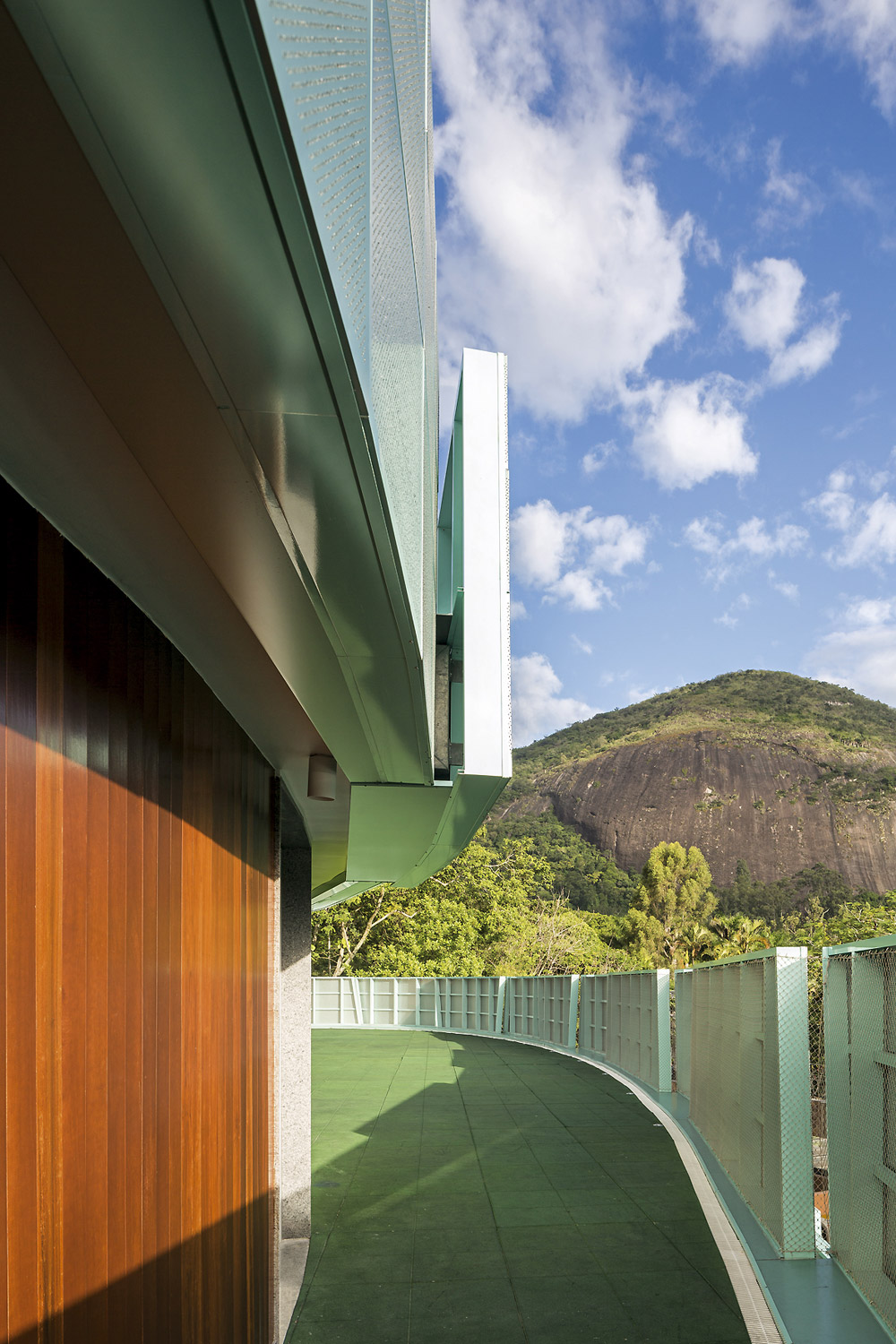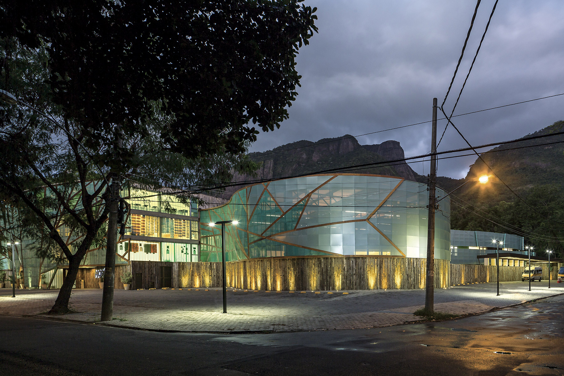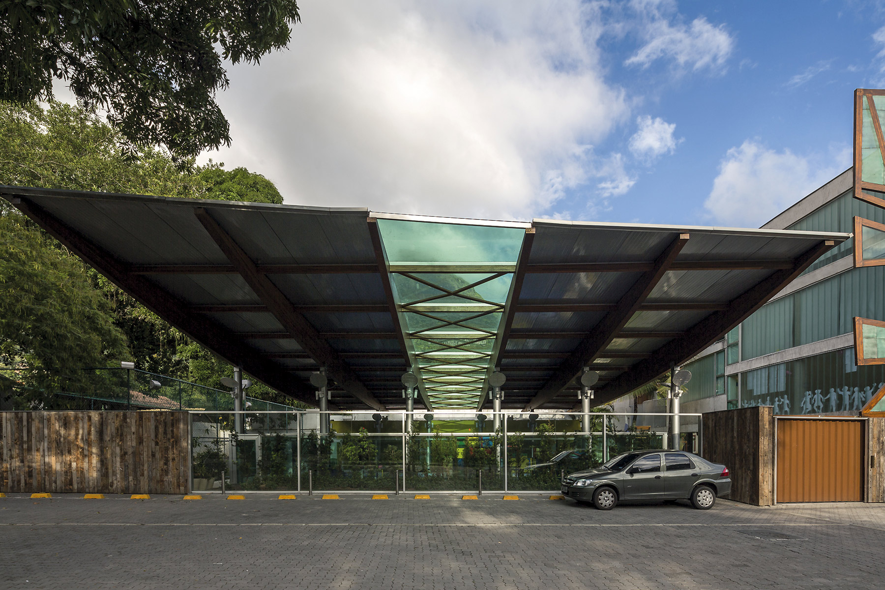 A intenção fundamental foi fazer com que o resultado final da construção feita em três fases ao longo de seis anos apresentasse fluidez e coerência para dar a ideia de unidade. Para atingir este objetivo trabalhamos com formas elípticas já utilizadas no projeto original. Todos os materiais e acabamentos também seguiram o projeto original, exceto pelo uso de chapas de ACM perfuradas no fechamento de guarda corpos e parte da fachada da arena poliesportiva. O embasamento de todo o conjunto foi revestido com cruzetas de poste, um material reutilizado. O prédio de planta elíptica que duplica a quantidade de salas de aula segue os níveis existentes do projeto original. Um terraço usado como área de recreio escancara a beleza das redondezas.