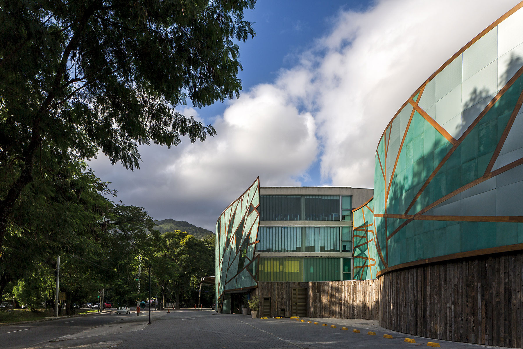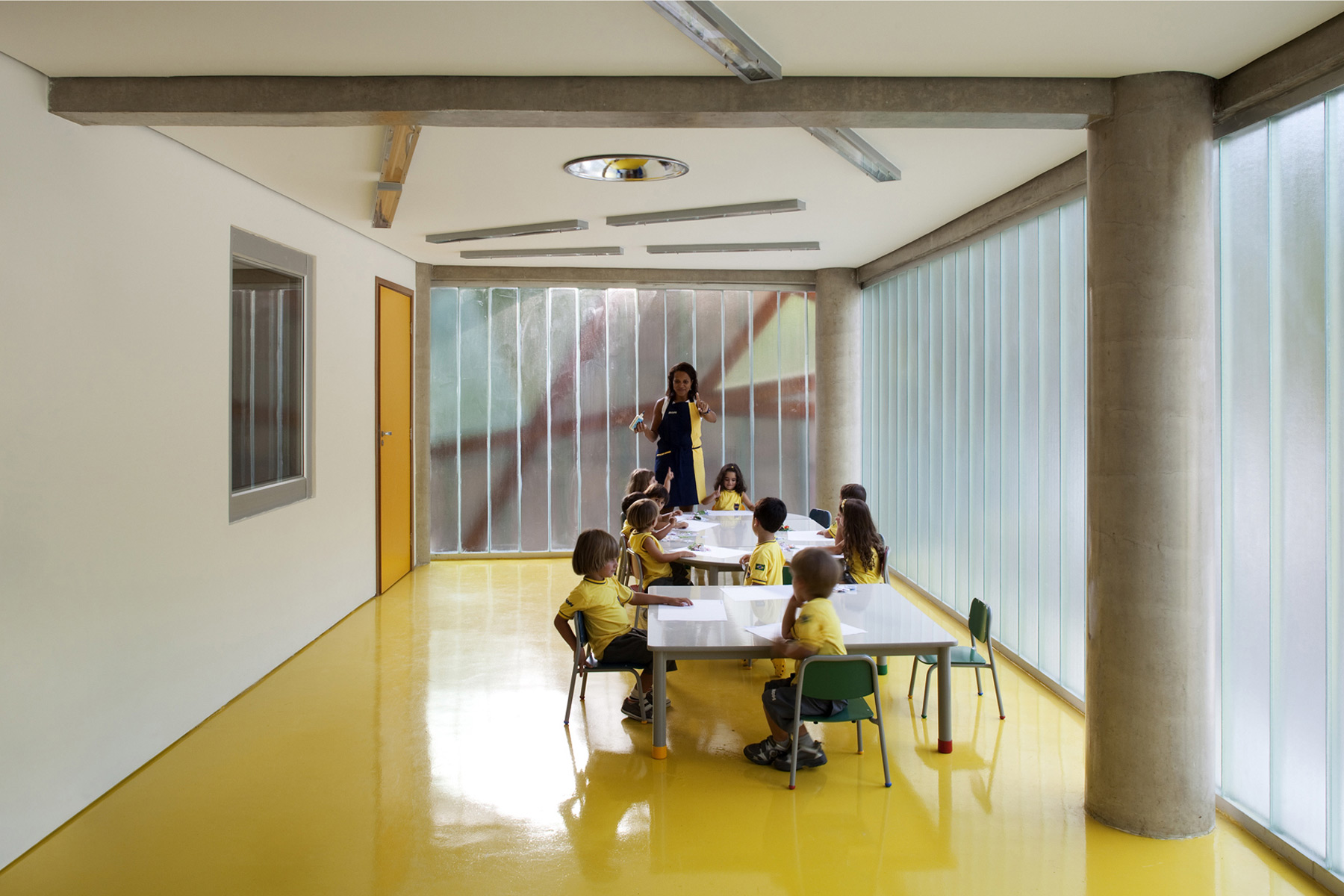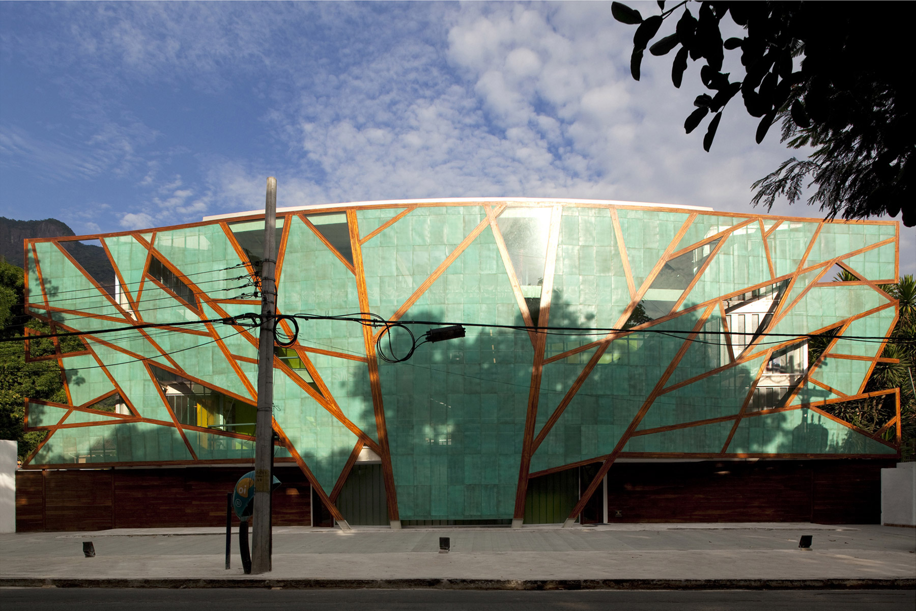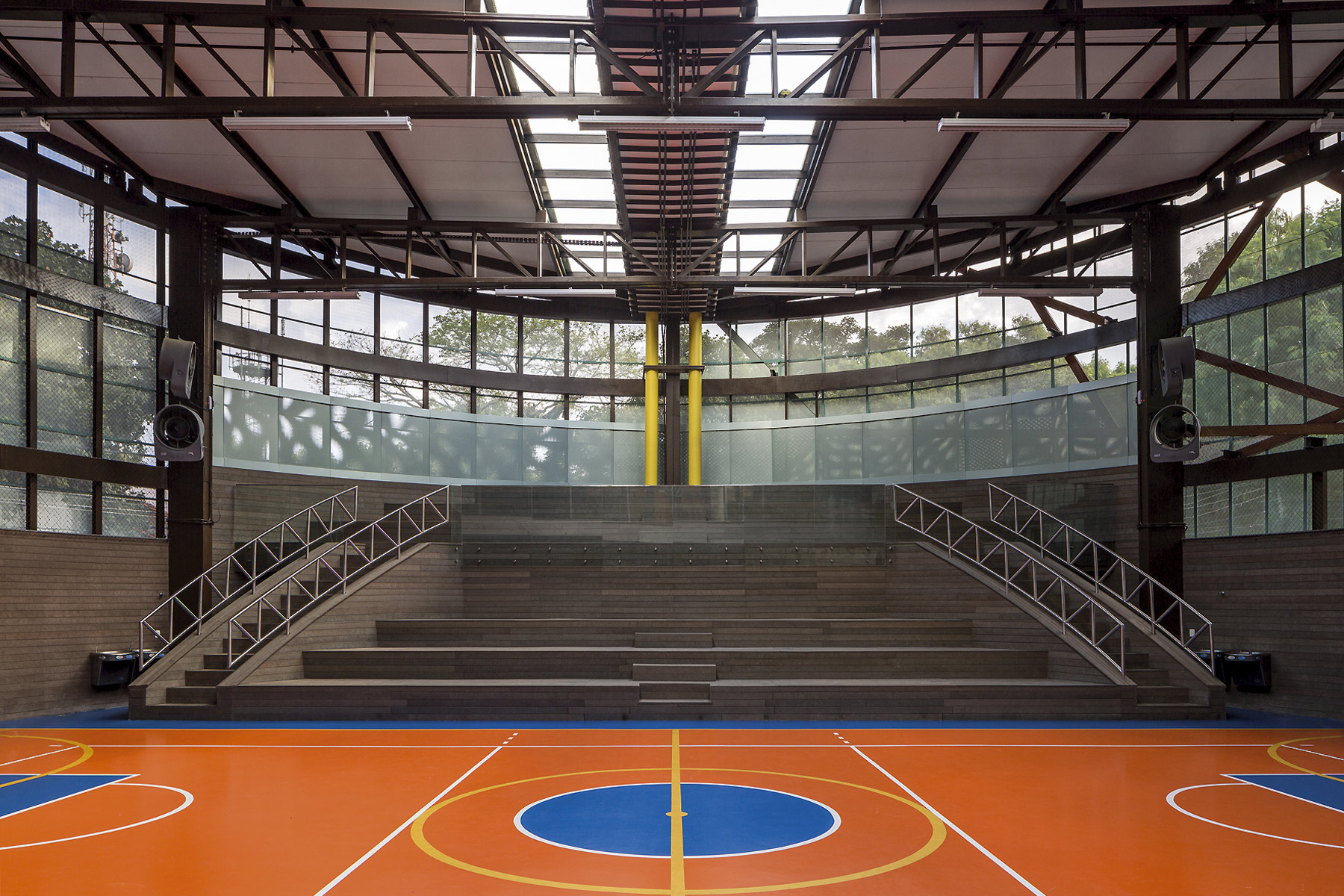 A intenção fundamental foi fazer com que o resultado final da construção feita em três fases ao longo de seis anos apresentasse fluidez e coerência para dar a ideia de unidade. Para atingir este objetivo trabalhamos com formas elípticas já utilizadas no projeto original. Todos os materiais e acabamentos também seguiram o projeto original, exceto pelo uso de chapas de ACM perfuradas no fechamento de guarda corpos e parte da fachada da arena poliesportiva. O embasamento de todo o conjunto foi revestido com cruzetas de poste, um material reutilizado. O prédio de planta elíptica que duplica a quantidade de salas de aula segue os níveis existentes do projeto original. Um terraço usado como área de recreio escancara a beleza das redondezas.