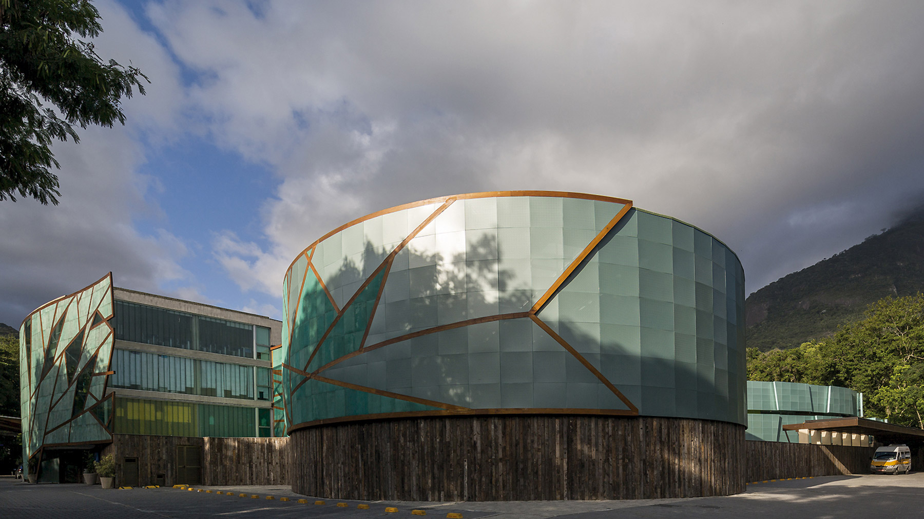 O prédio foi concebido como quatro volumes separados que se conectam por meio de varandas de circulação. A planta do conjunto deriva de prédio em forma de “U” com a parte aberta voltada para as belas vistas naturais. Os dois volumes elípticos que se voltam para a avenida contêm as 20 salas de aula, enquanto as outras duas em forma de gotas d’água contém salas complementares como de arte, ciências, computação e biblioteca. O fato de dividir o prédio em quatro volumes facilita a circulação de ar e o resfriamento natural das salas, bem como deixa muito claro as diferentes funções de cada um, servindo como forte referência visual.